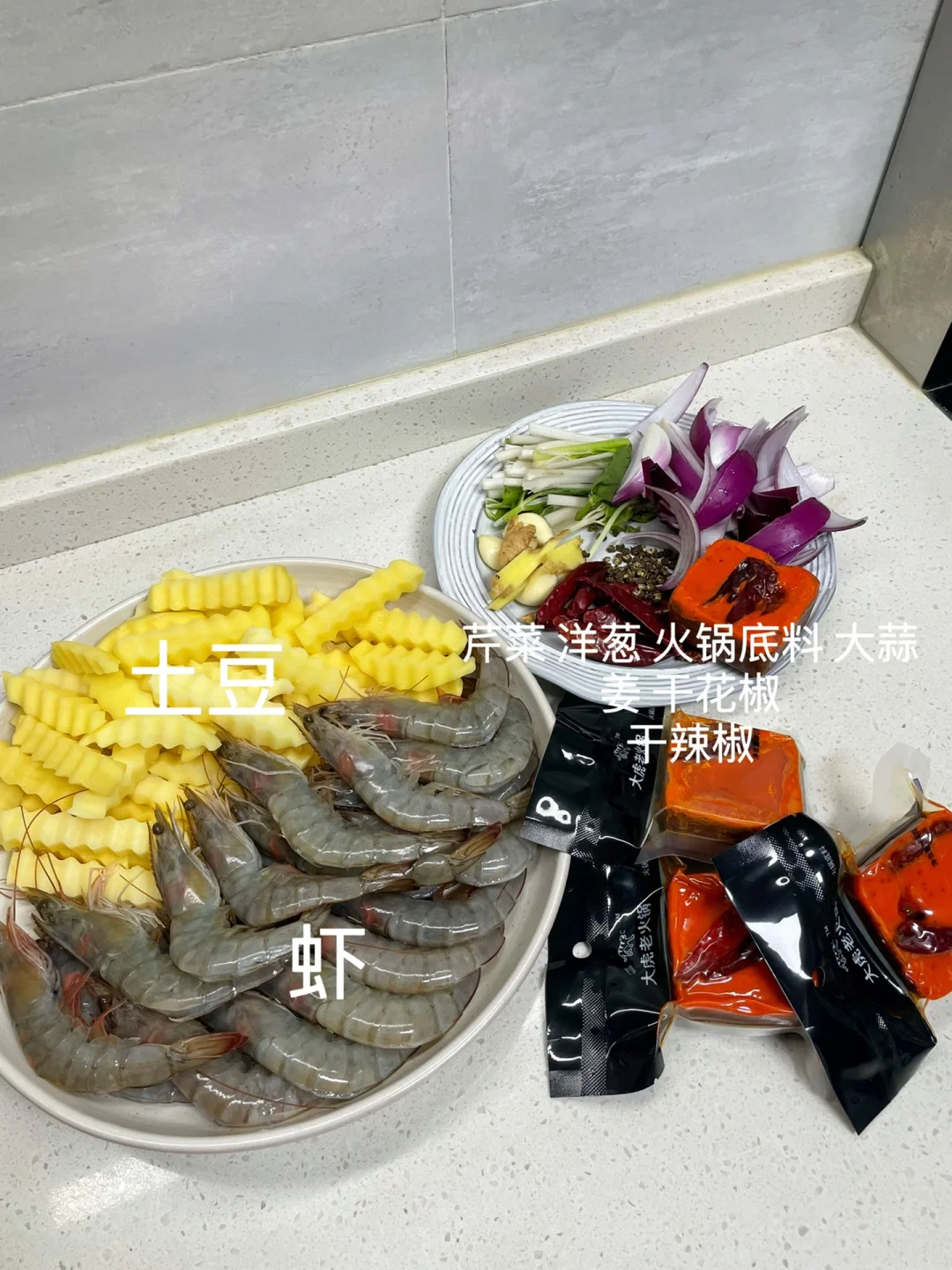 1⃣️:虾开背去虾线,土豆切条备用
