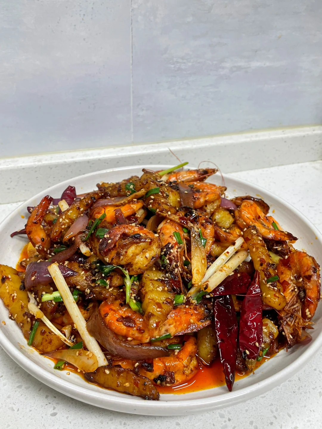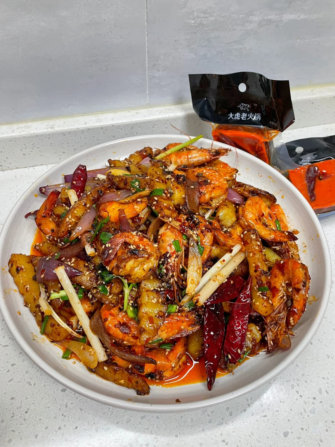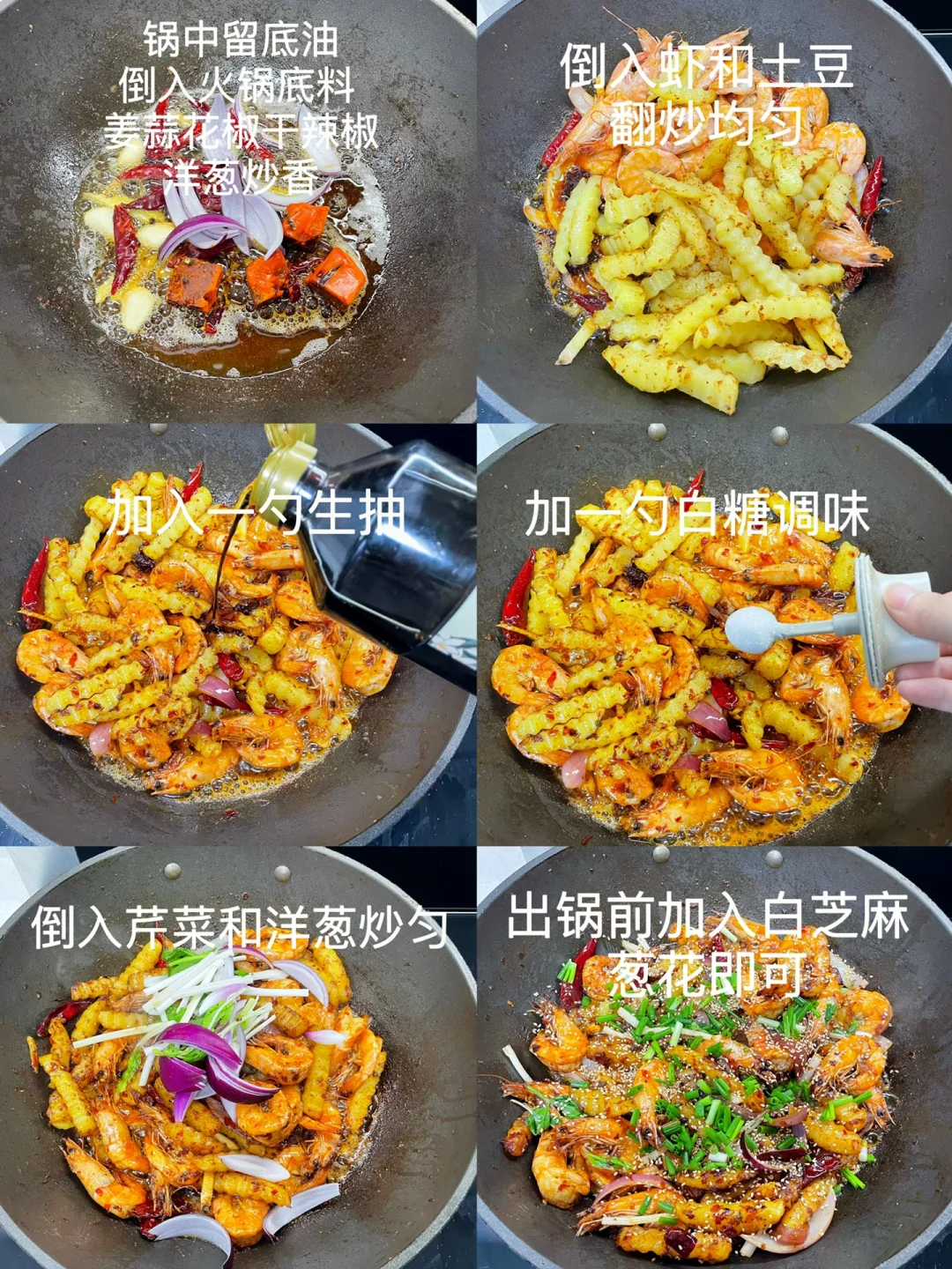 3⃣️:锅中留底油,倒入火锅底料和其他佐料炒香,再倒入煎好的虾和土豆炒匀,加一勺生抽和一勺白糖调味,放入芹菜和洋葱炒软,出锅前加入熟白芝麻和葱花即可