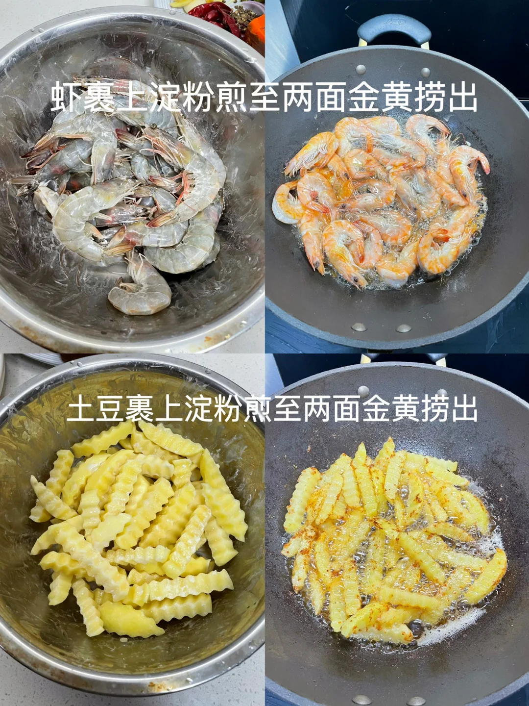 2⃣️:土豆和虾分别裹上淀粉,油热下锅煎至两面金黄捞出