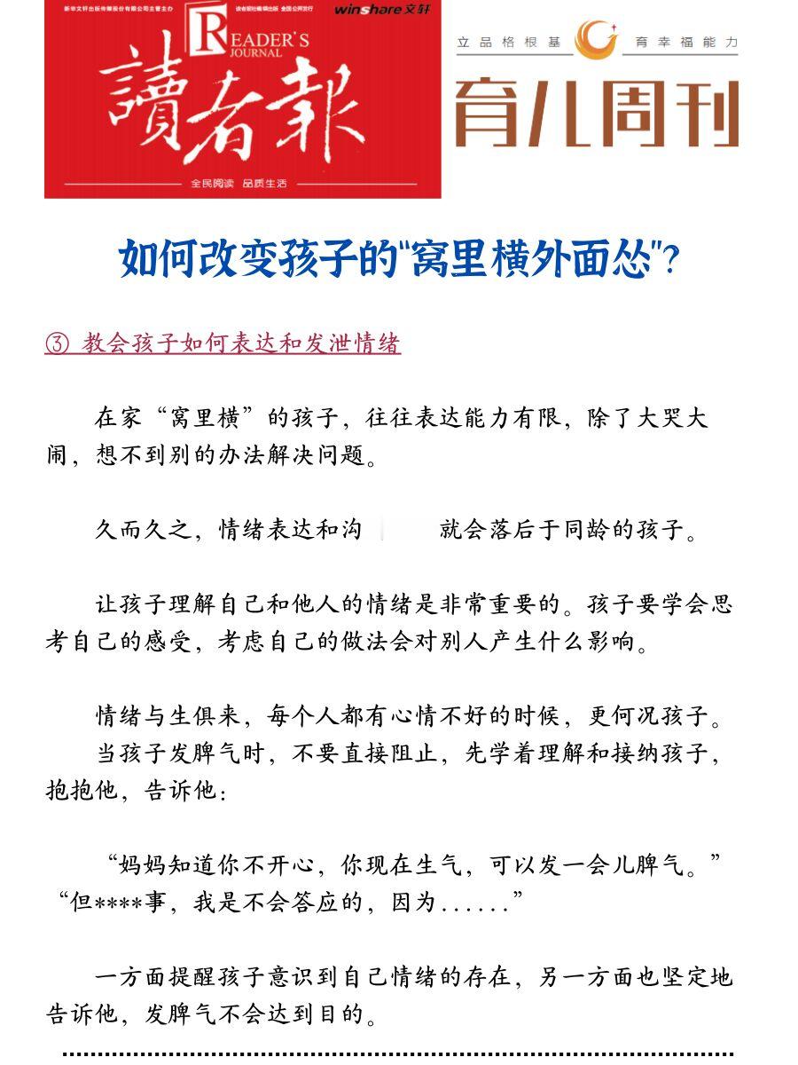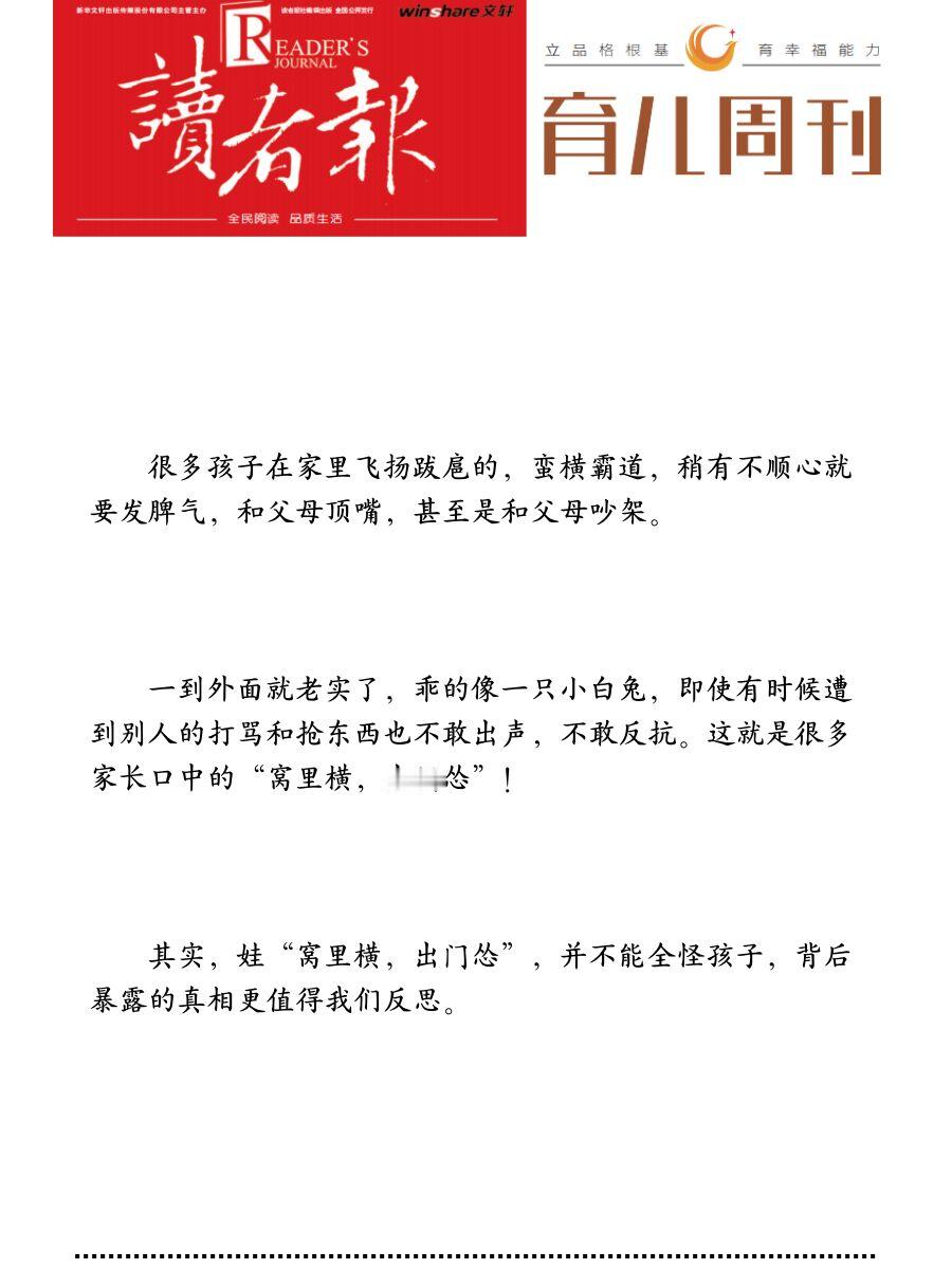 很多孩子在家里飞扬跋扈的,蛮横霸道,稍有不顺心就要发脾气,和父母顶嘴,甚至是和父母吵架。 一到外面就老实了,乖的像一只小白兔,即使有时候遭到别人的打骂和抢东西也不敢出声,不敢反抗。这就是很多家长口中的“窝里横,出门怂”! 其实,娃“窝里横,出门怂”,并不能全怪孩子,背后暴露的真相更值得我们反思。
