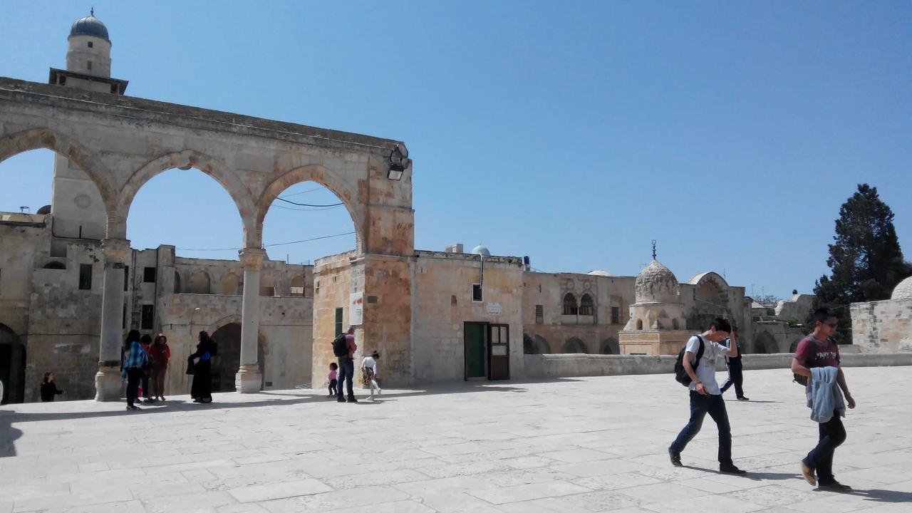 这就是阿克萨清真寺,穆斯林朝圣的地方。记得当时我们去参观的时候,恰逢巴勒斯坦民众想赶走来参观的犹太教徒。这名教徒由荷枪实弹的犹太警察保护,一群巴勒斯坦小孩朝他们扔石头,场面乱哄哄。