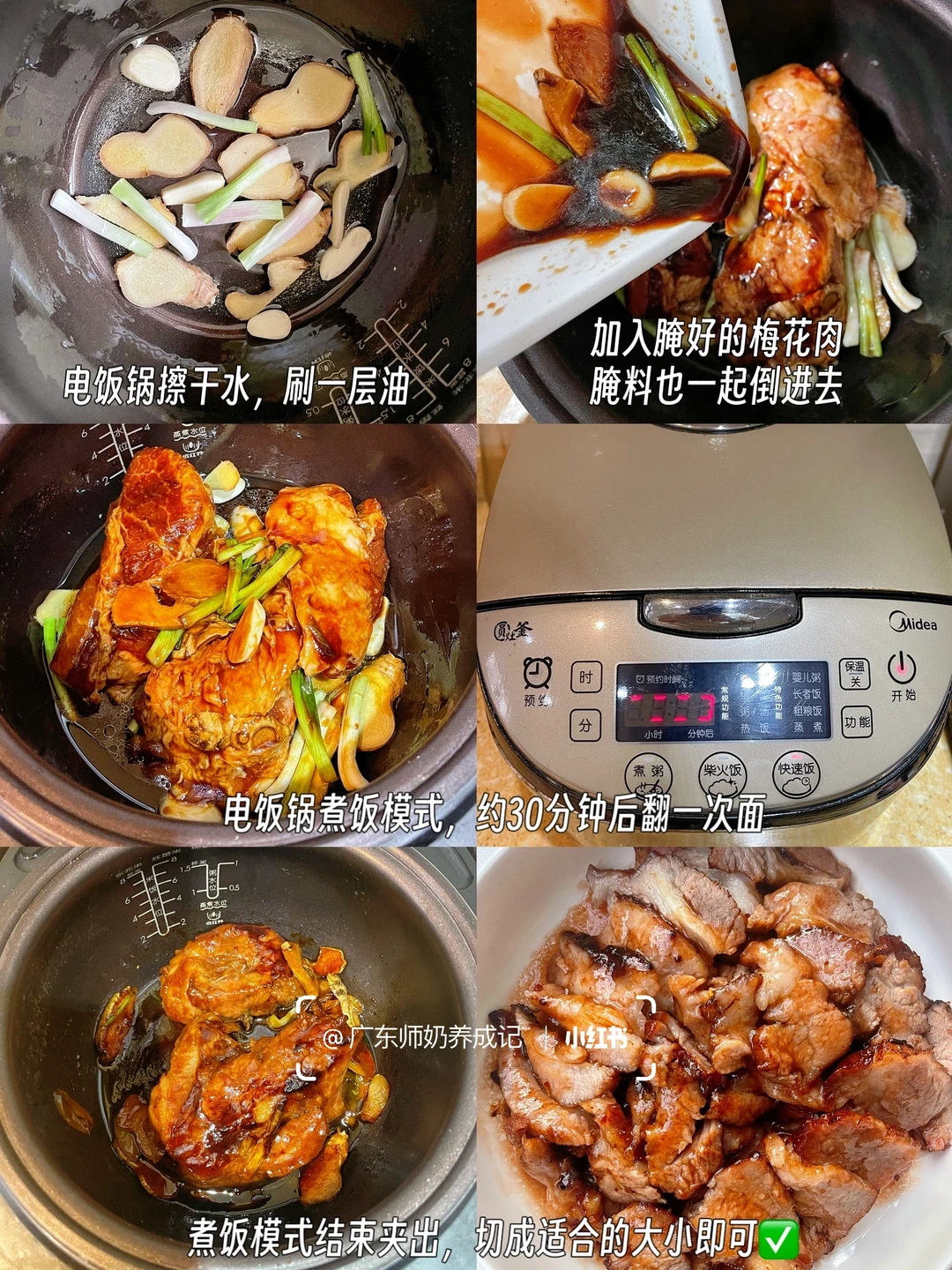 2⃣电饭锅擦干水分,底部刷少许油,放入葱姜蒜和梅花肉,把剩下的腌料也倒进去,打开煮饭模式,焖30分钟,翻一次面,再焖10分钟。