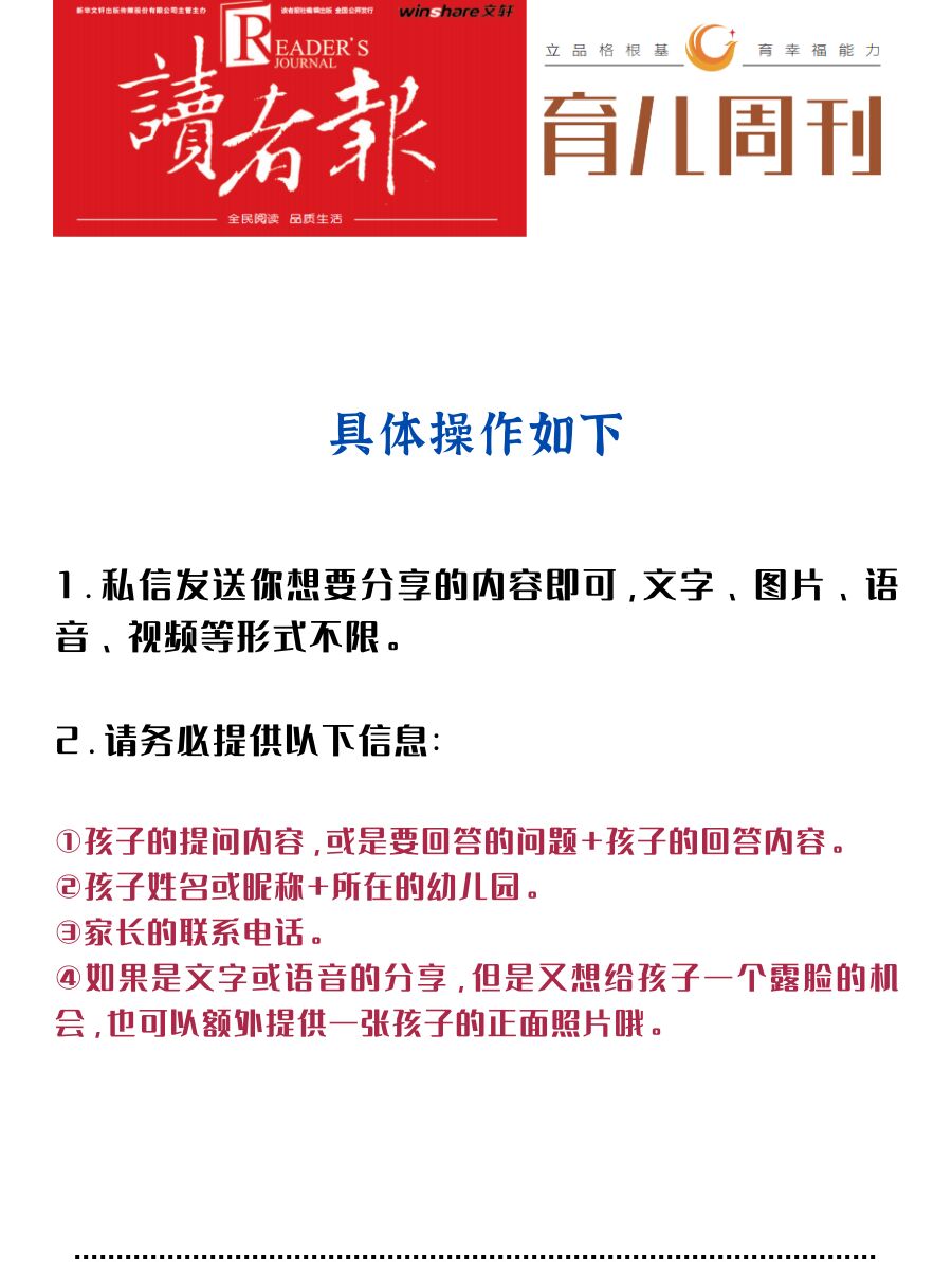[二R]另外,孩子们精彩的提问和有趣的回答,都有可能刊登在《育儿周刊》的版面上,被所有的读者看到。登刊的小朋友还会获得《育儿周刊》出具的“共创小伙伴”荣誉证书哦!