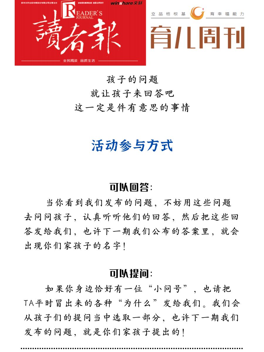 当你看到我们发布的问题,不妨用这些问题去问问孩子,认真听听他们的回答,然后把这些回答发给我们,也许下一期我们公布的答案里,就会出现你们家孩子的名字!