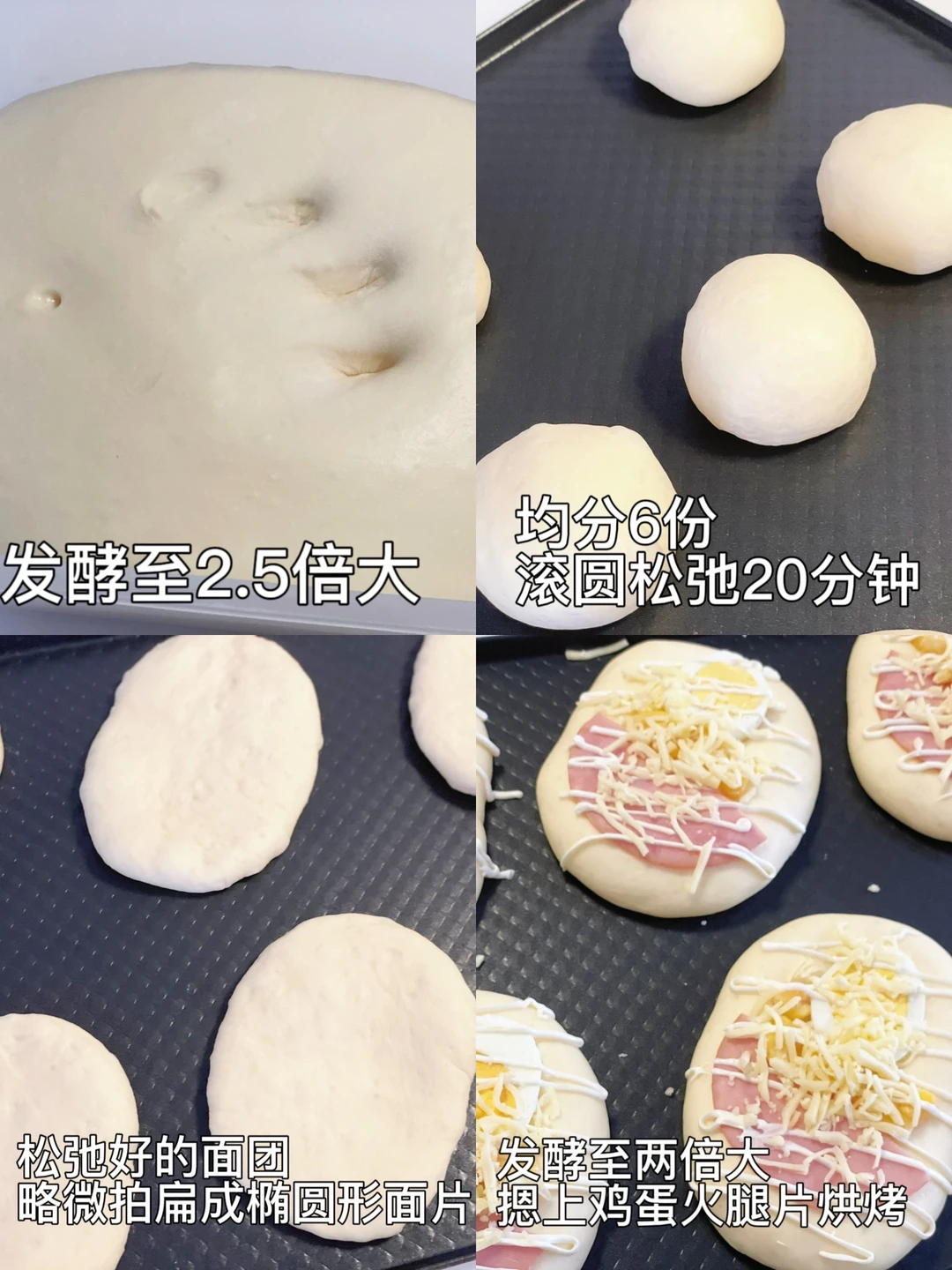 7⃣️发酵好的面团表面摁入半个鸡蛋和半片火腿;再撒上玉米粒和芝士碎,挤上沙拉酱。送入上火180/下火200度预热好的烤箱烘烤15分钟
