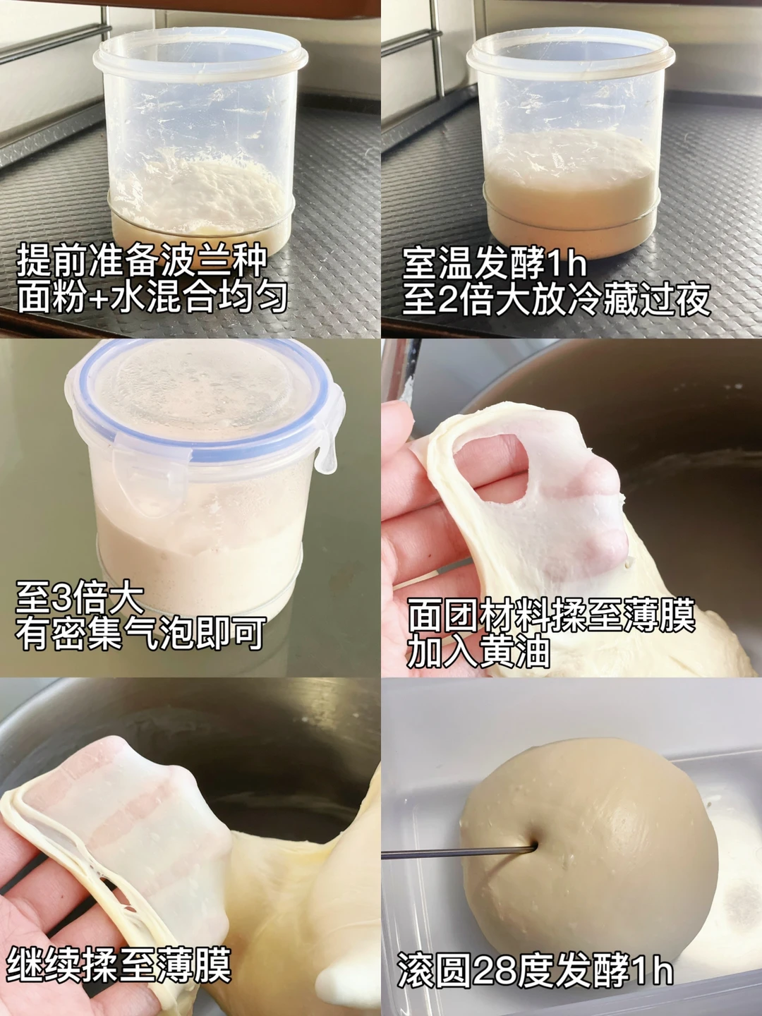 1⃣️提前制作波兰种,干酵母用水化开,倒入面粉搅拌均匀,室温发酵1h至两倍大转冷藏过夜备用