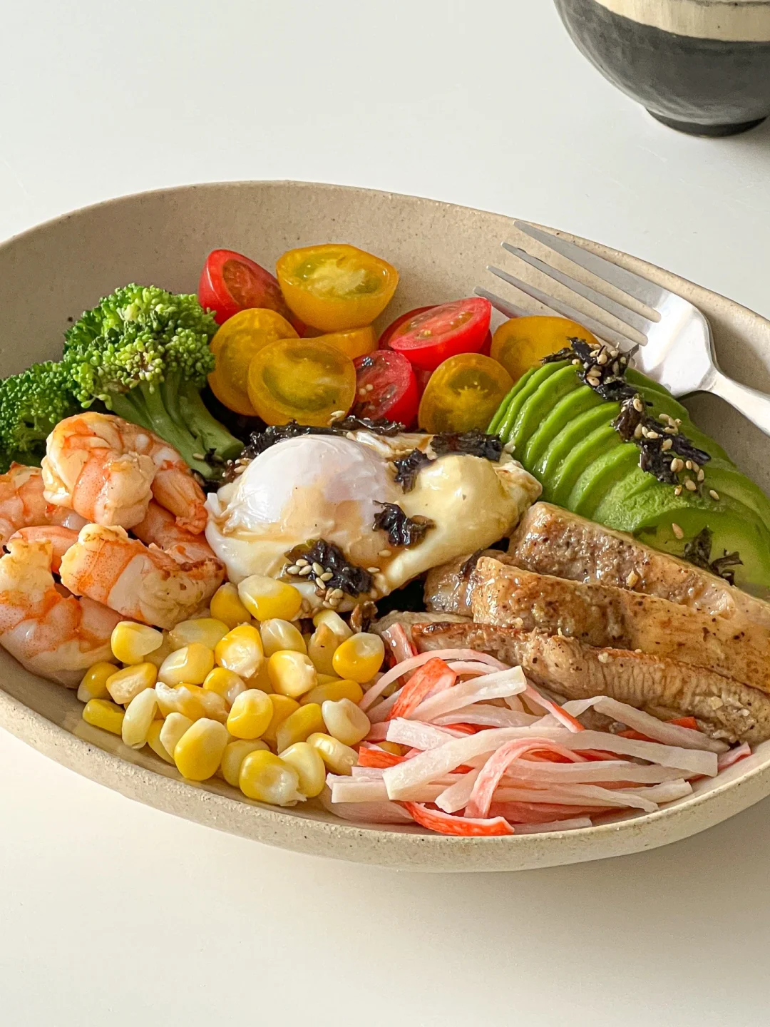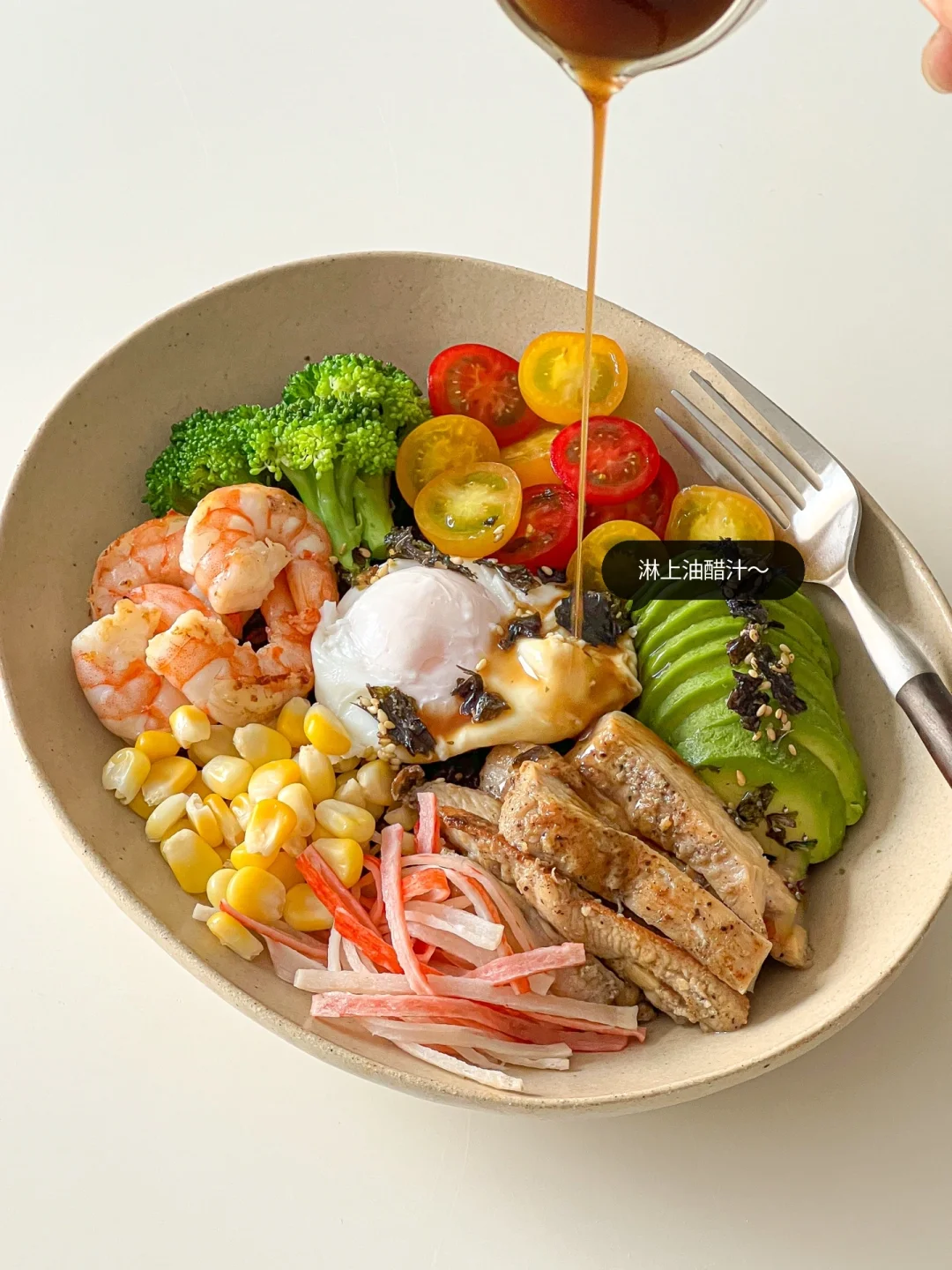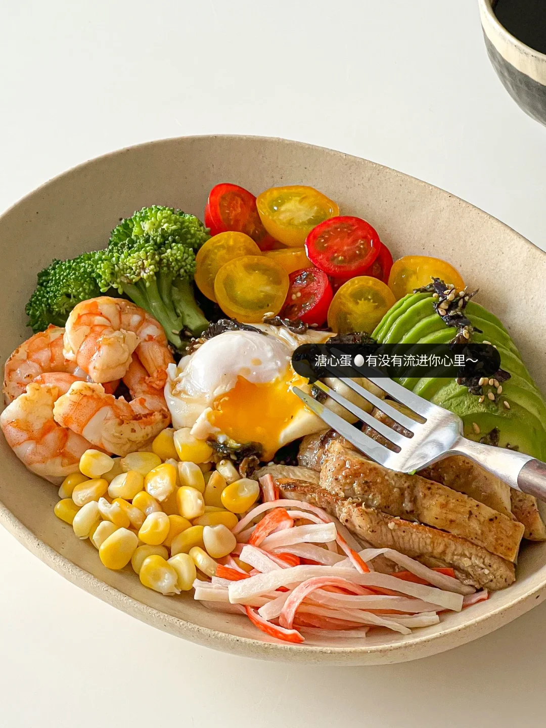 杂粮饭🍚、小番茄、西兰花🥦、虾仁🍤、牛油果🥑、黑胡椒鸡胸肉、无菌蛋🥚、蟹柳、玉米粒