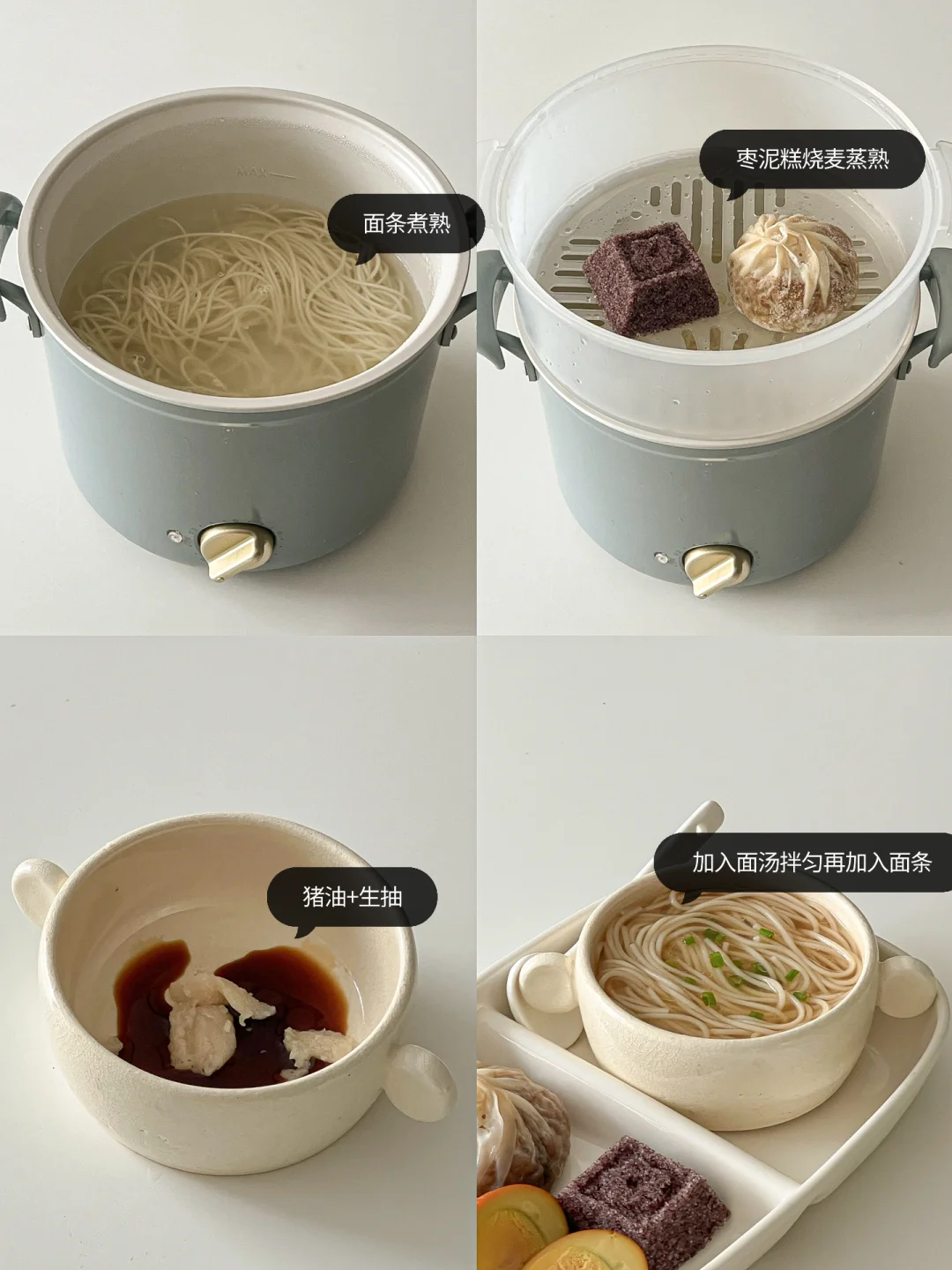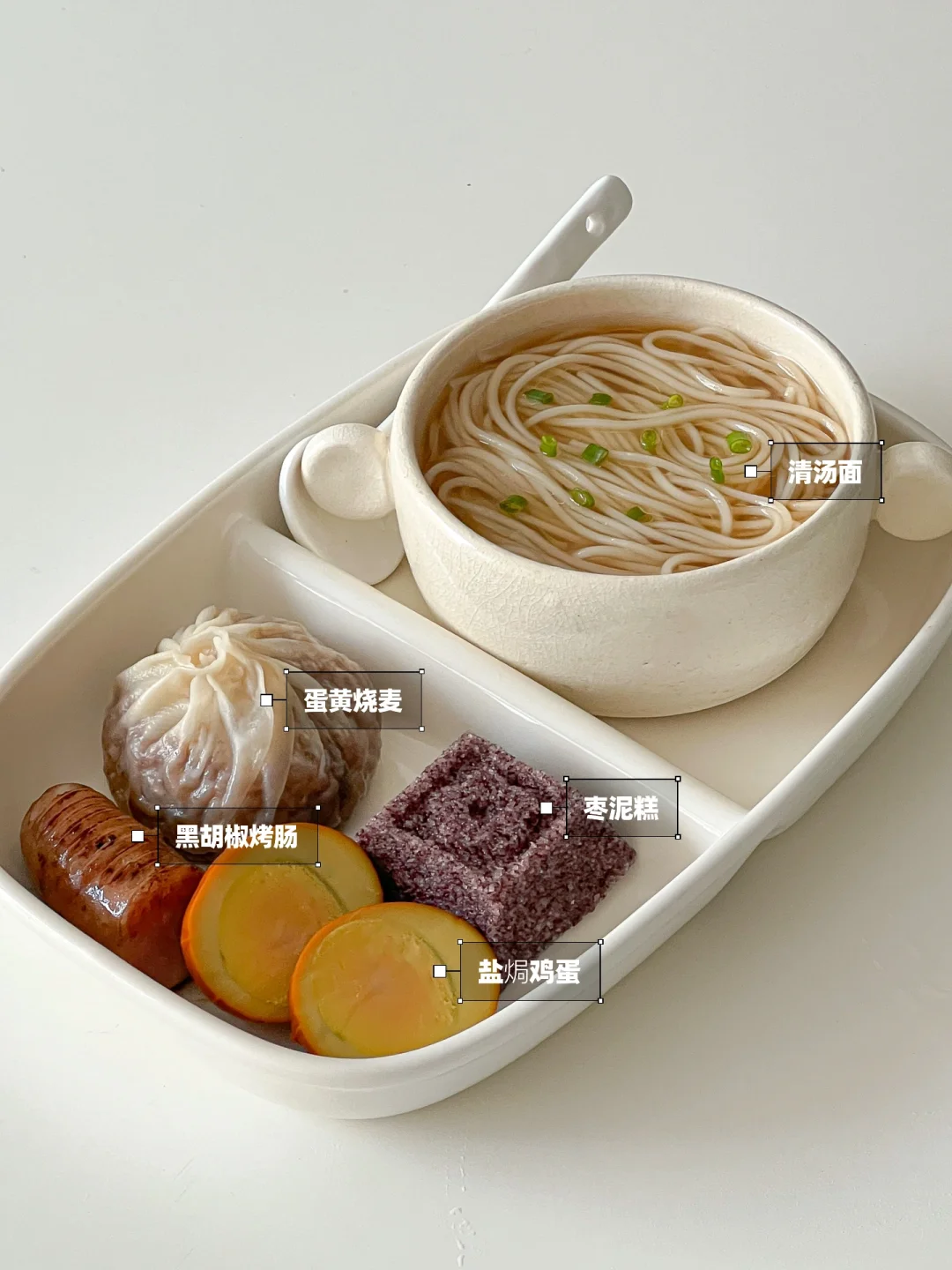 🥢清汤面+芝士烧麦+枣泥糕+黑胡椒烤肠+盐焗鸡蛋