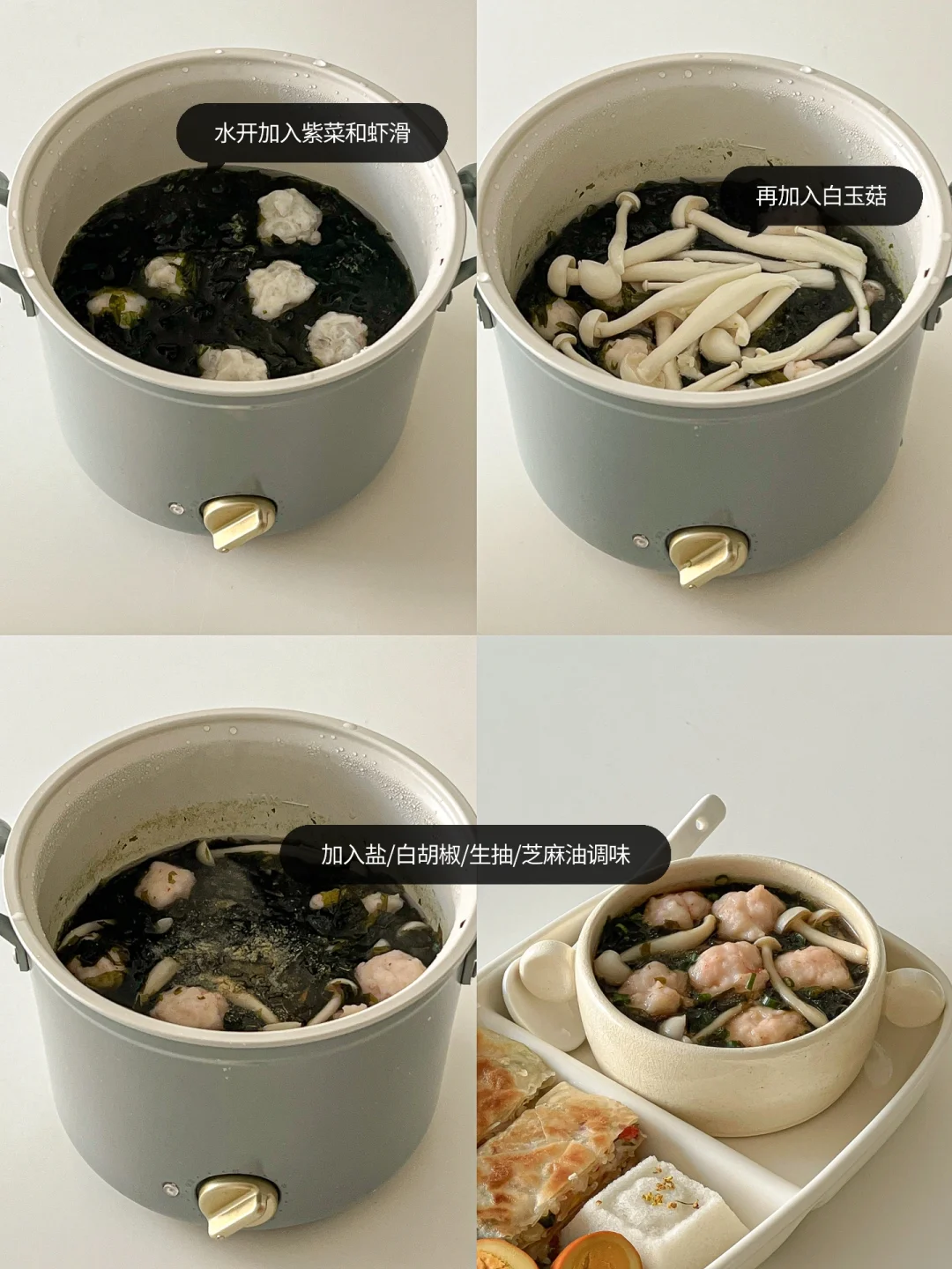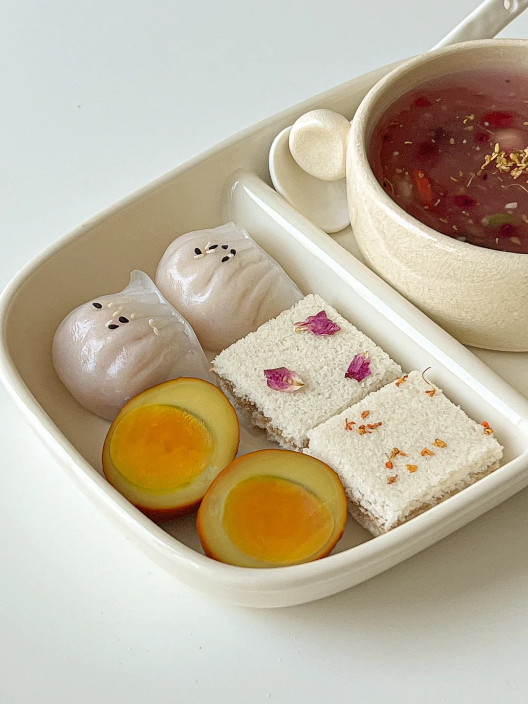 🥢虾滑紫菜汤+豇豆饼+桂花豆沙糕+巴旦木奶枣+盐焗