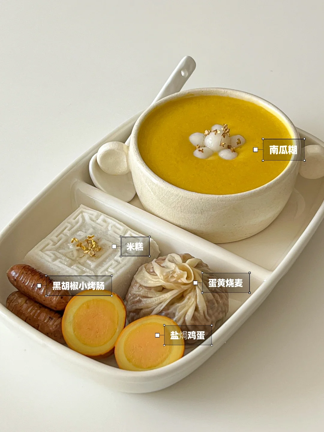 🥢南瓜糊+米糕+黑胡椒小烤肠+蛋黄烧麦+盐焗鸡蛋