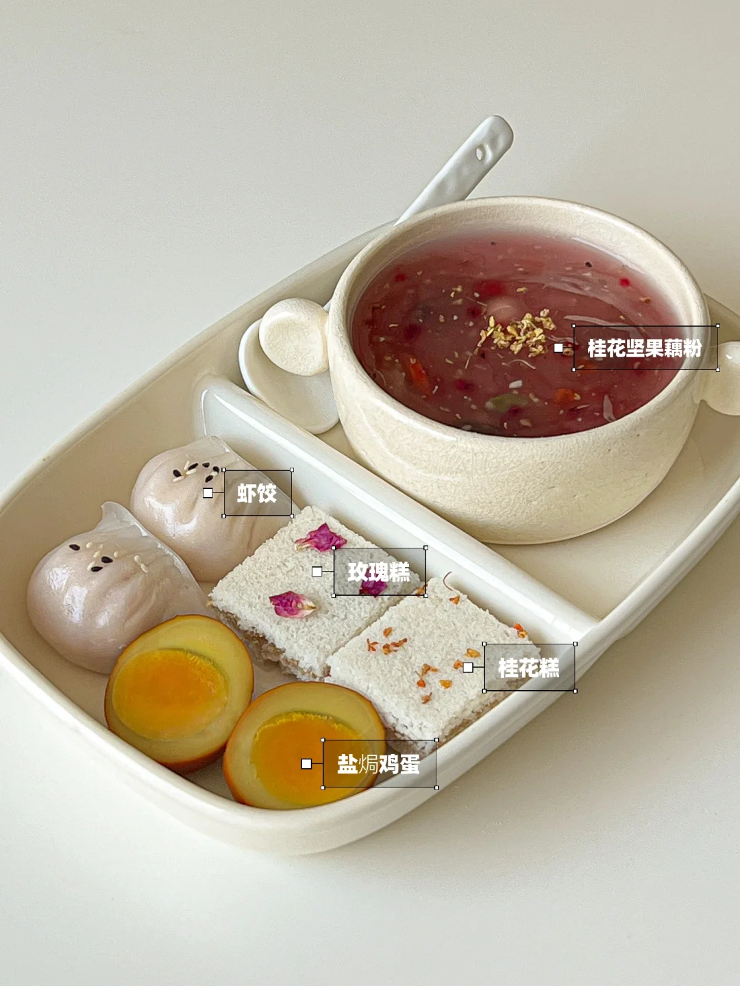 🥢桂花藕粉+虾饺+玫瑰糕+桂花糕+盐焗鸡蛋