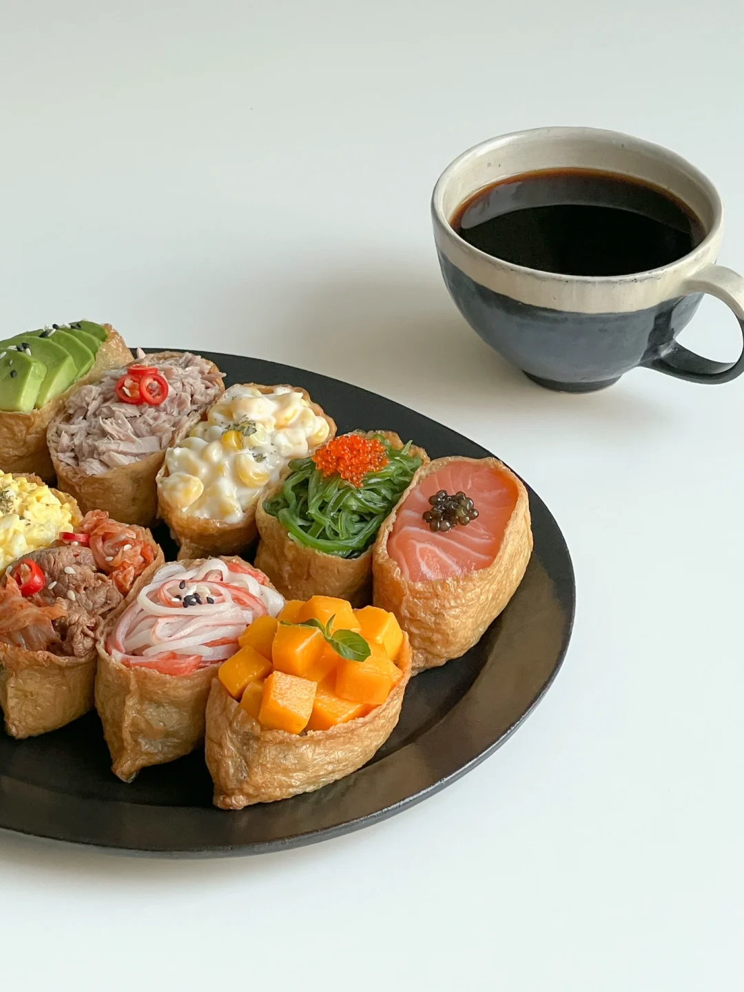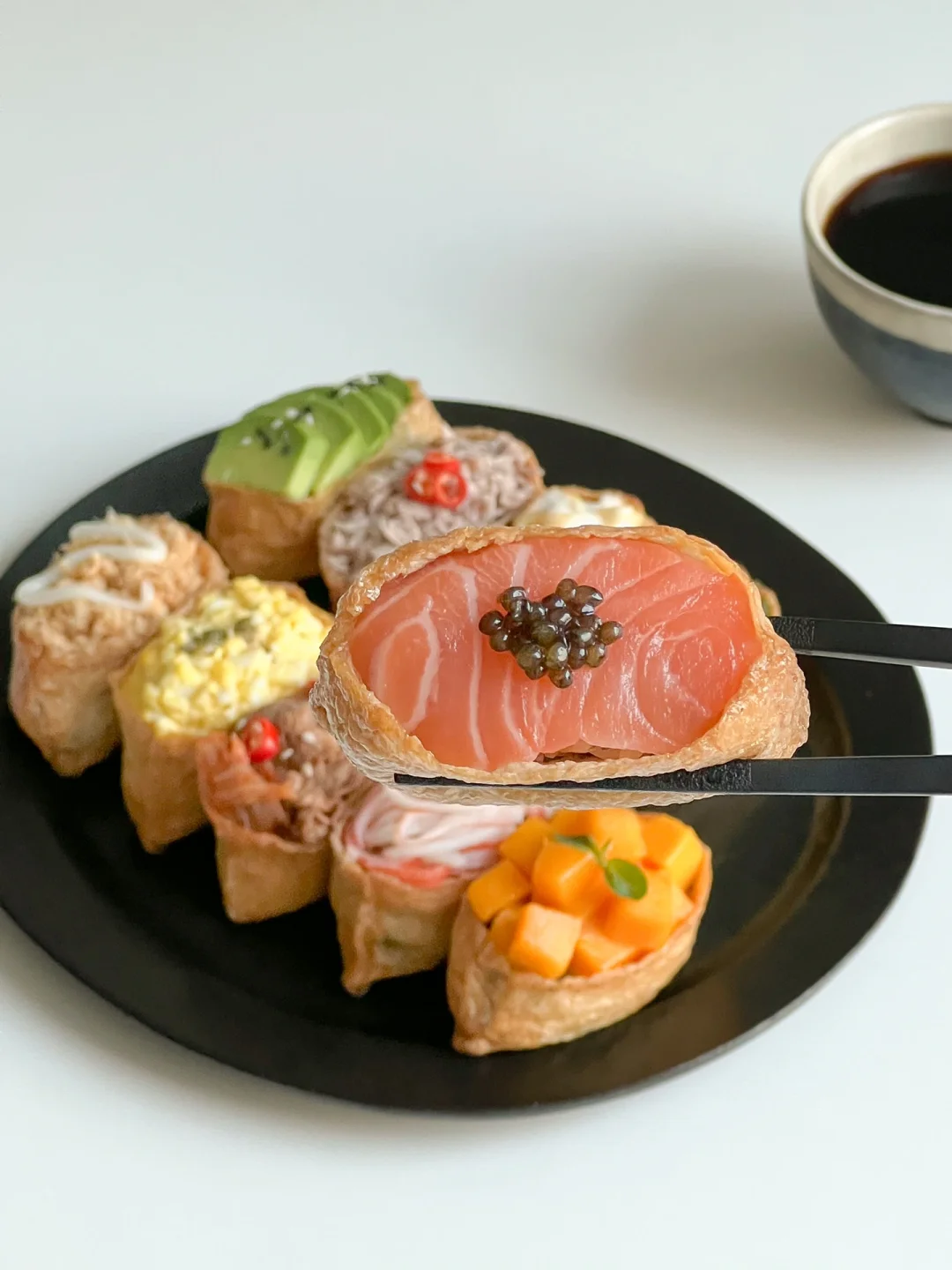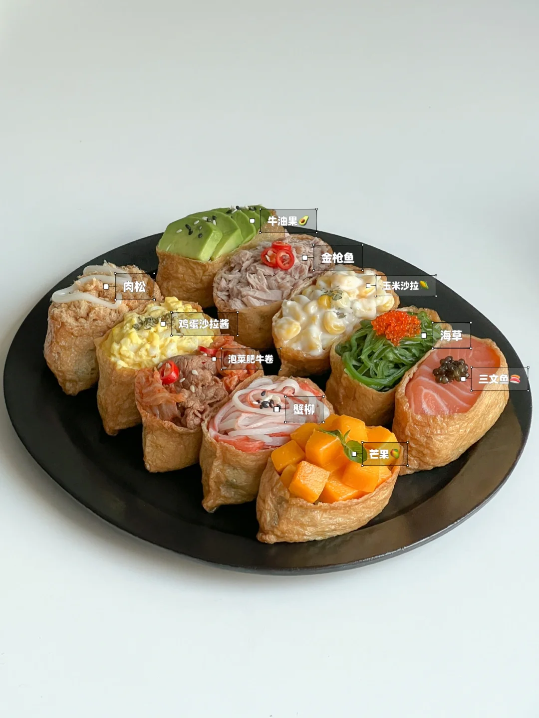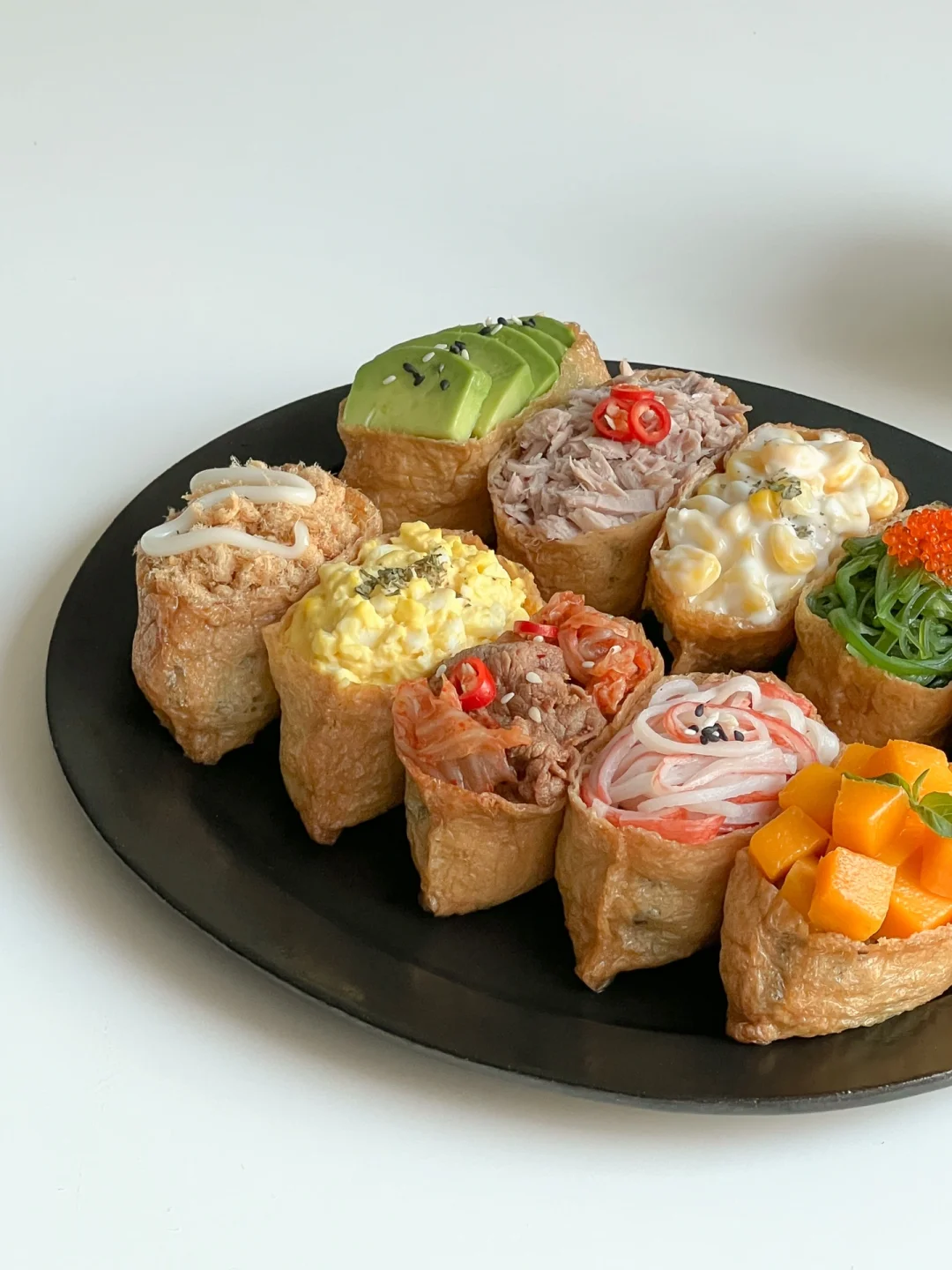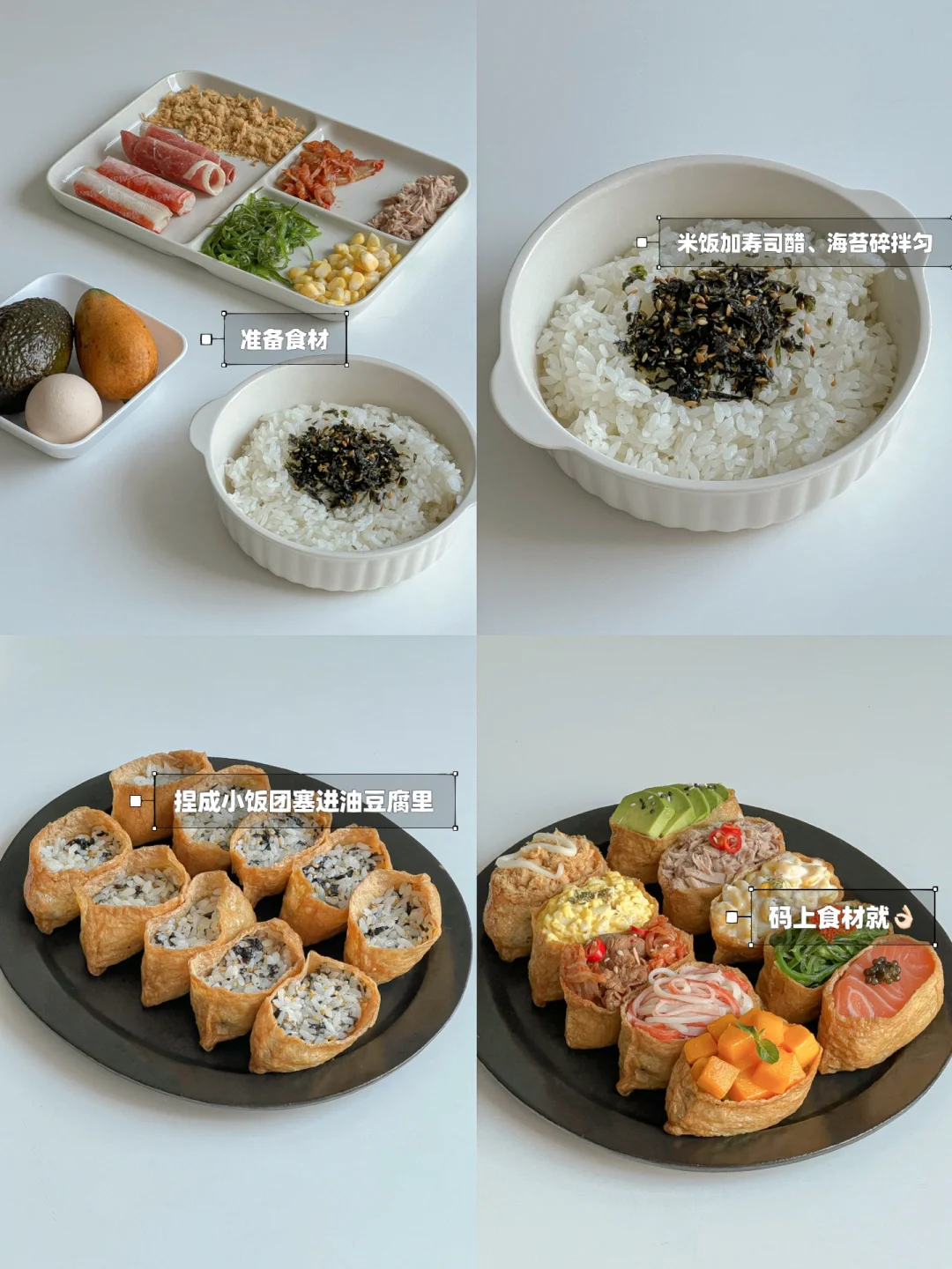 馋了很久的日式寿司今天终于解锁啦~ 陷料可以根据自己的喜欢来调整 这次我一次性做了10种不同口味🙌🏻 做法简单 颜值也是敲高的 特别适合在野餐的时候安排上 不但拍照好看 味道也赞😋 · 🧾食材准备: 油豆腐、米饭、拌饭海苔、寿司醋、三文鱼🍣、芒果🥭、海草、牛油果🥑、金枪鱼、玉米🌽、鸡蛋🥚、肥牛卷、泡菜、蟹柳、肉松 👩🏻🍳做法: ❶米饭加寿司醋和海苔碎拌匀 ❷米饭捏成小饭团,塞进油豆腐里 ❸肥牛和泡菜,放一点生抽,炒熟 ❹鸡蛋煮熟加蛋黄酱捣成泥 ❺玉米粒加沙拉酱拌匀 ❻码上所有食材