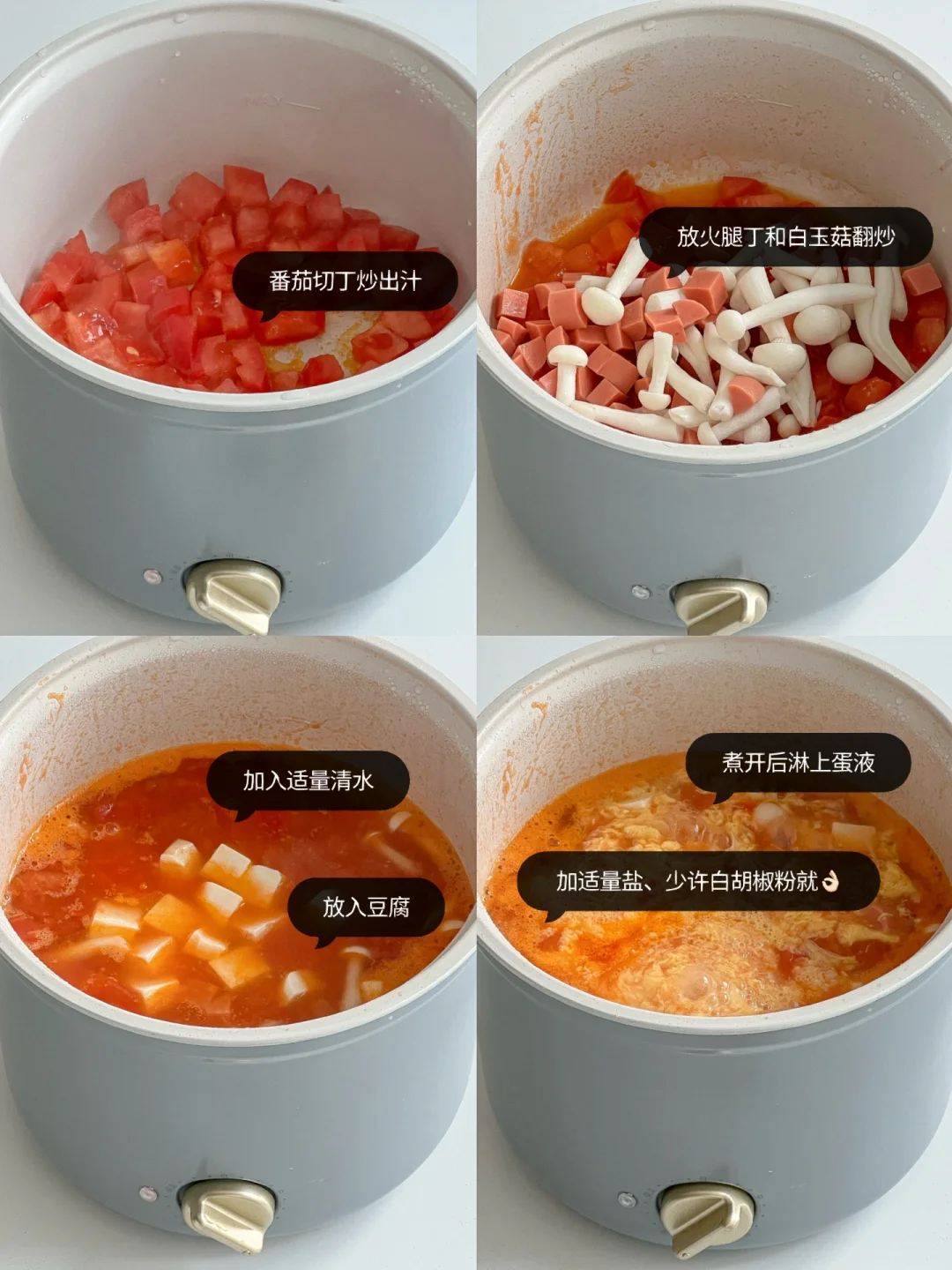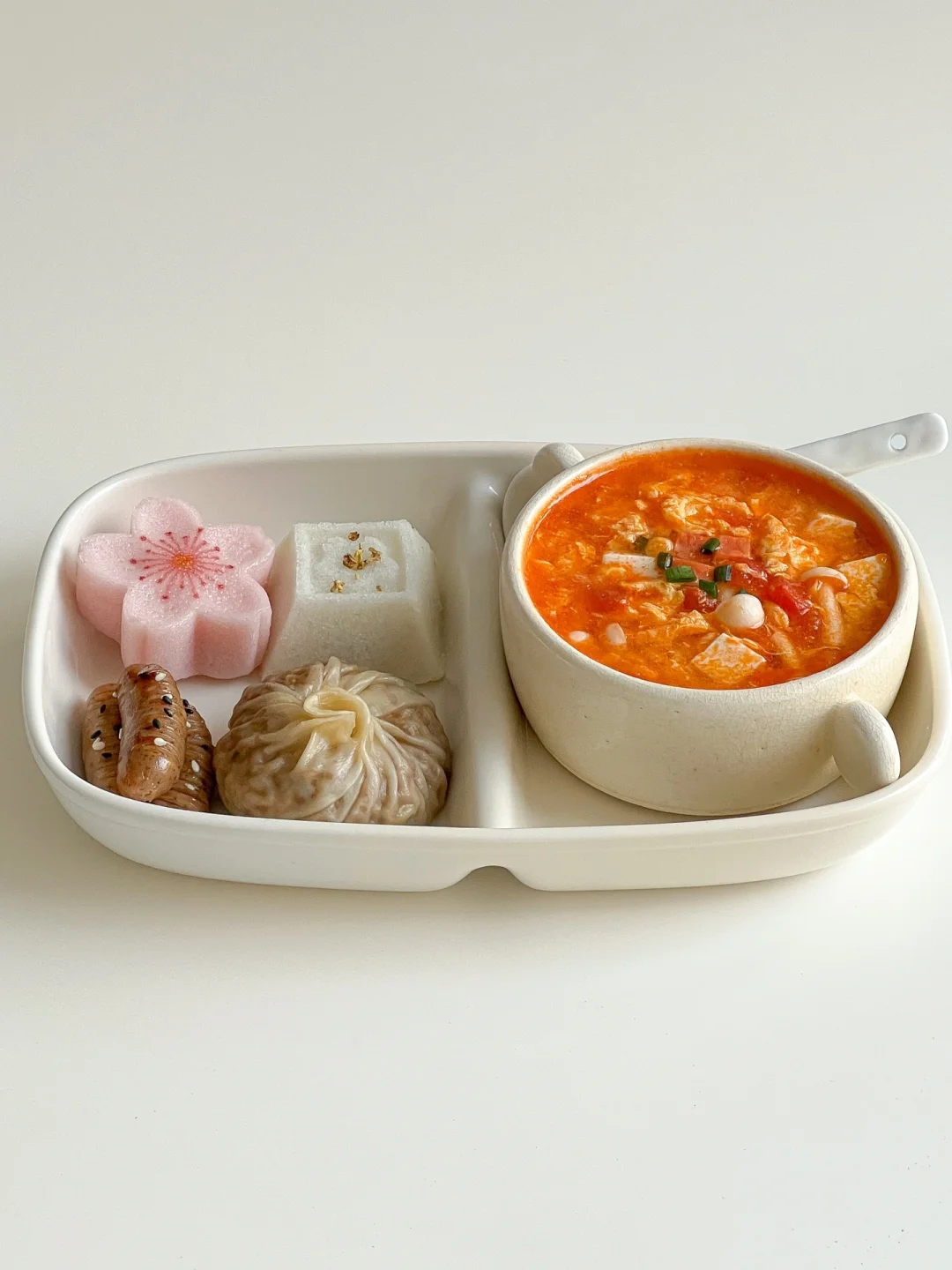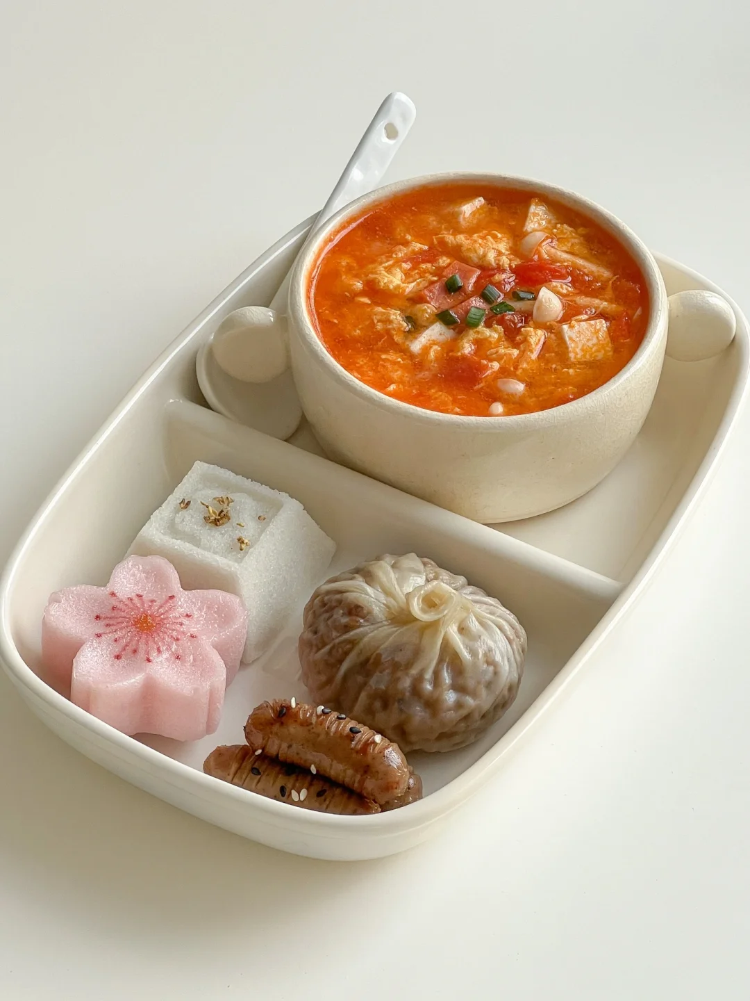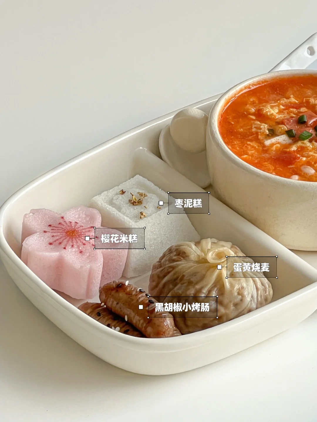 今天又是一顿精致的中式早餐🤭 樱花米糕简直美到心巴上了😍 还有番茄鸡蛋火腿汤🥣酸酸甜甜好喝又开胃~ · 🧾食材: 番茄🍅、火腿肠、白玉菇、鸡蛋🥚、豆腐、蛋黄烧麦、枣泥糕、黑胡椒小烤肠、樱花米糕🌸 👩🏻🍳做法: ❶樱花米糕、蛋黄烧麦、枣泥糕,上锅蒸熟 ❷煎黑胡椒小烤肠 ❸番茄切丁炒出汁,加入火腿丁、白玉菇翻炒 ❹加入适量清水后,放入豆腐 ❺煮开后淋上蛋液 ❻加适量盐和少许白胡椒粉即可