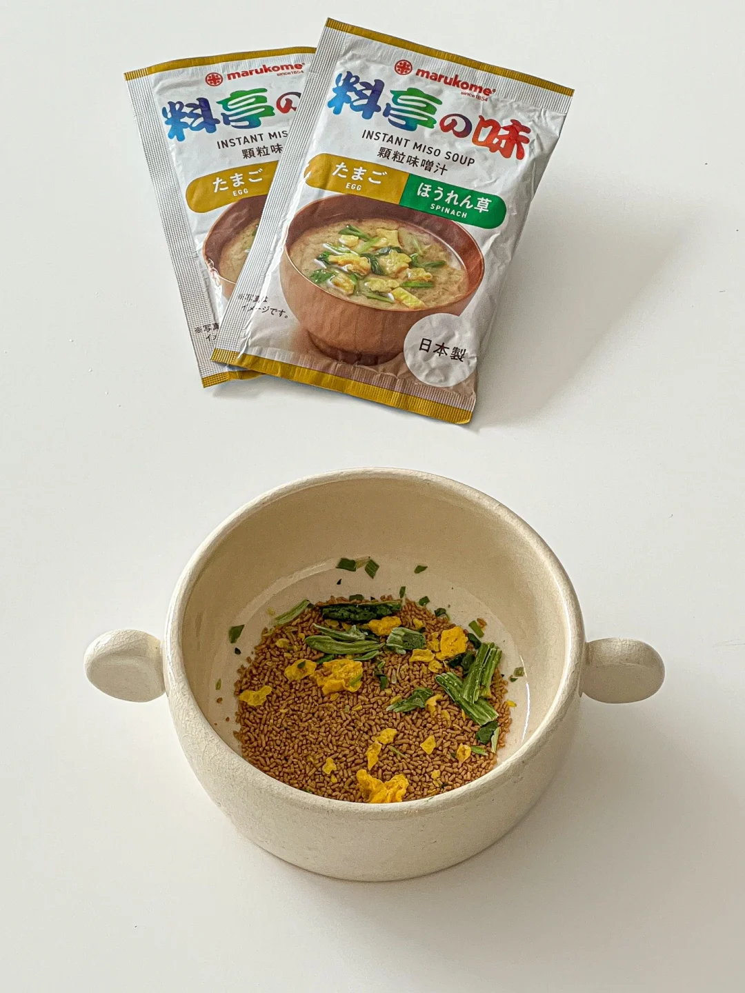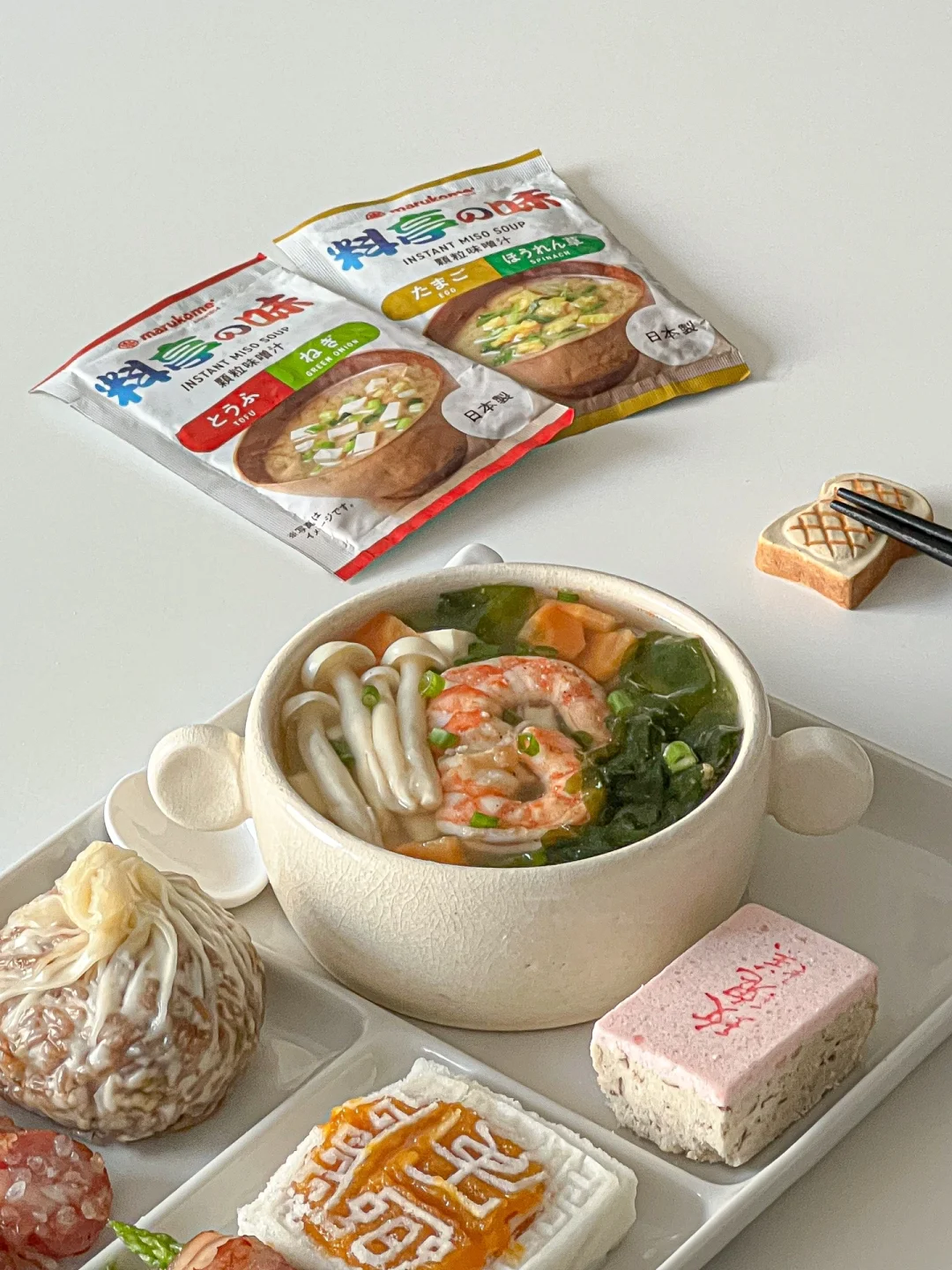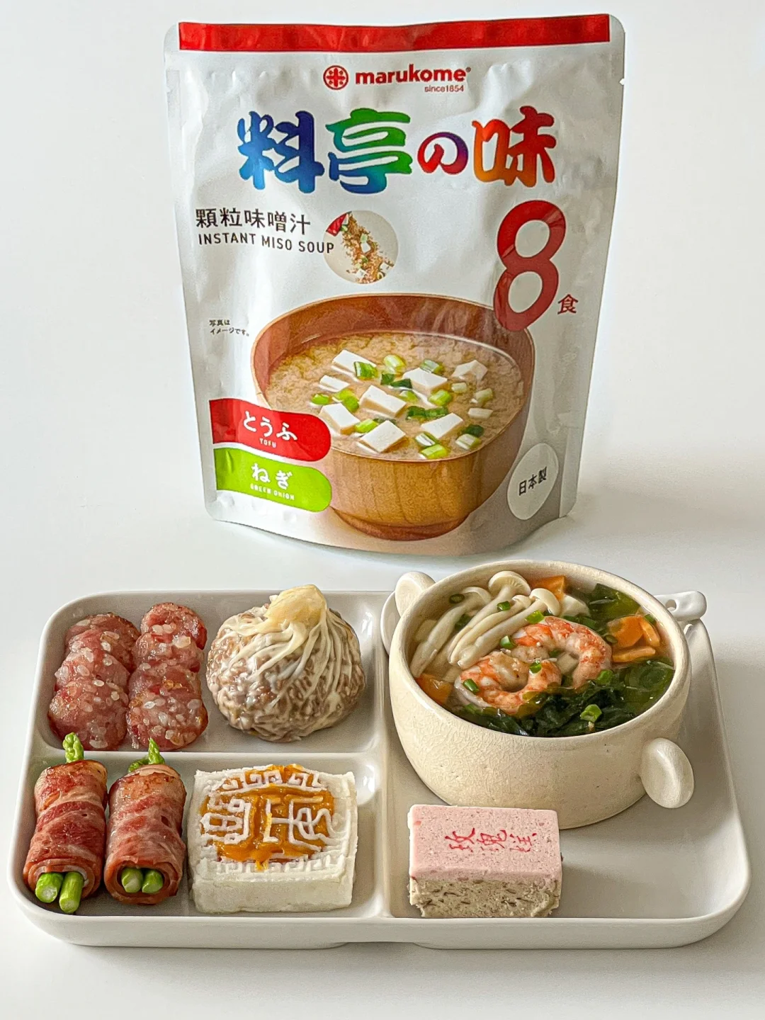 味噌做汤底可以增香增鲜,是万能调味料,简简单单一包就可以增加风味;我用的是日本marukome玛露蔻美的,是日本正宗的味噌老品牌了,含有昆布和鲣鱼熬制的高汤,味道hin正,hin鲜美,还配有鸡蛋、菠菜、豆腐、小葱,每袋用160ml热水30s冲泡即饮,也可以像我一样加一些爱吃的食材煮熟然后加这个汤包就🉑,里面有8袋,一餐一袋,方便又健康,懒人必备~