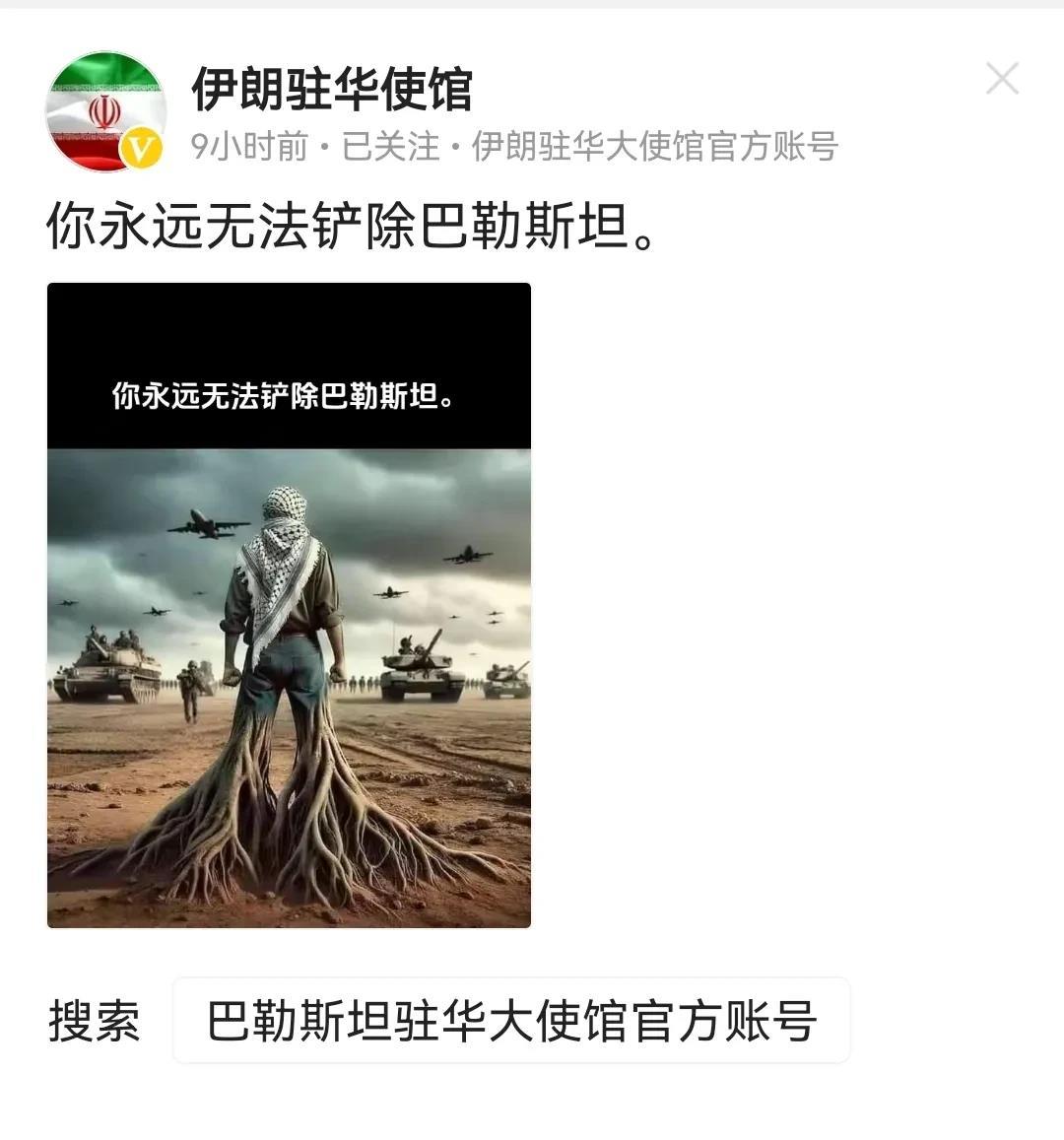 中国老百姓对伊朗大使馆发布的文案很容易就撺火上头,伊朗人打悲情牌也好,悲壮牌也罢,总之应为高人,感觉挺懂中国人。寥寥数语也没说什么就让大部分中国人回忆起咱过去,感同身受很容易就产生共鸣……