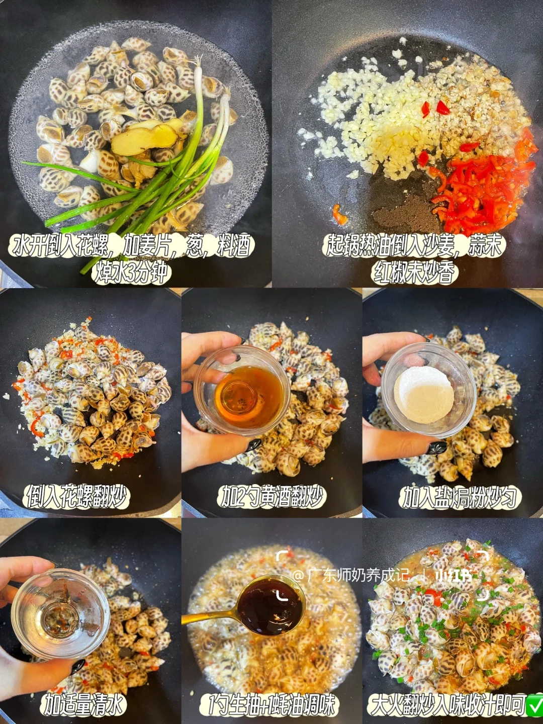 1⃣️花螺买回来加点盐吐沙半天,水开后加姜片,葱,料酒焯水1分钟