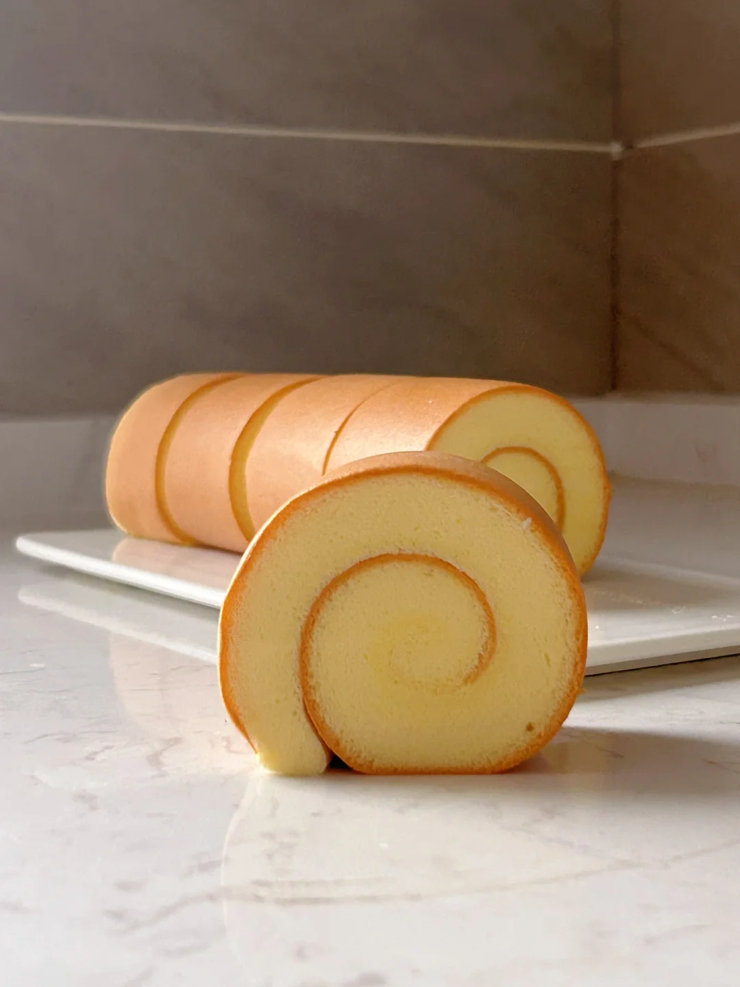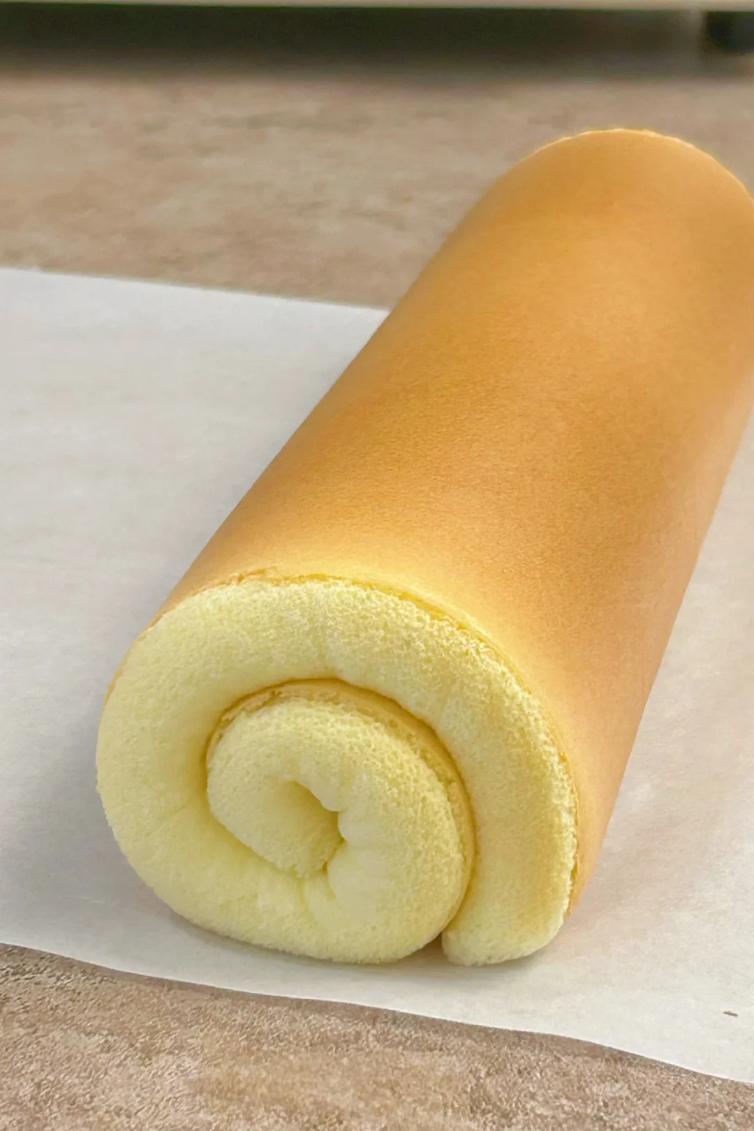 6️⃣烤好的蛋糕卷晾到温热,最后借助擀面杖卷起,室温定型半小时在切开。