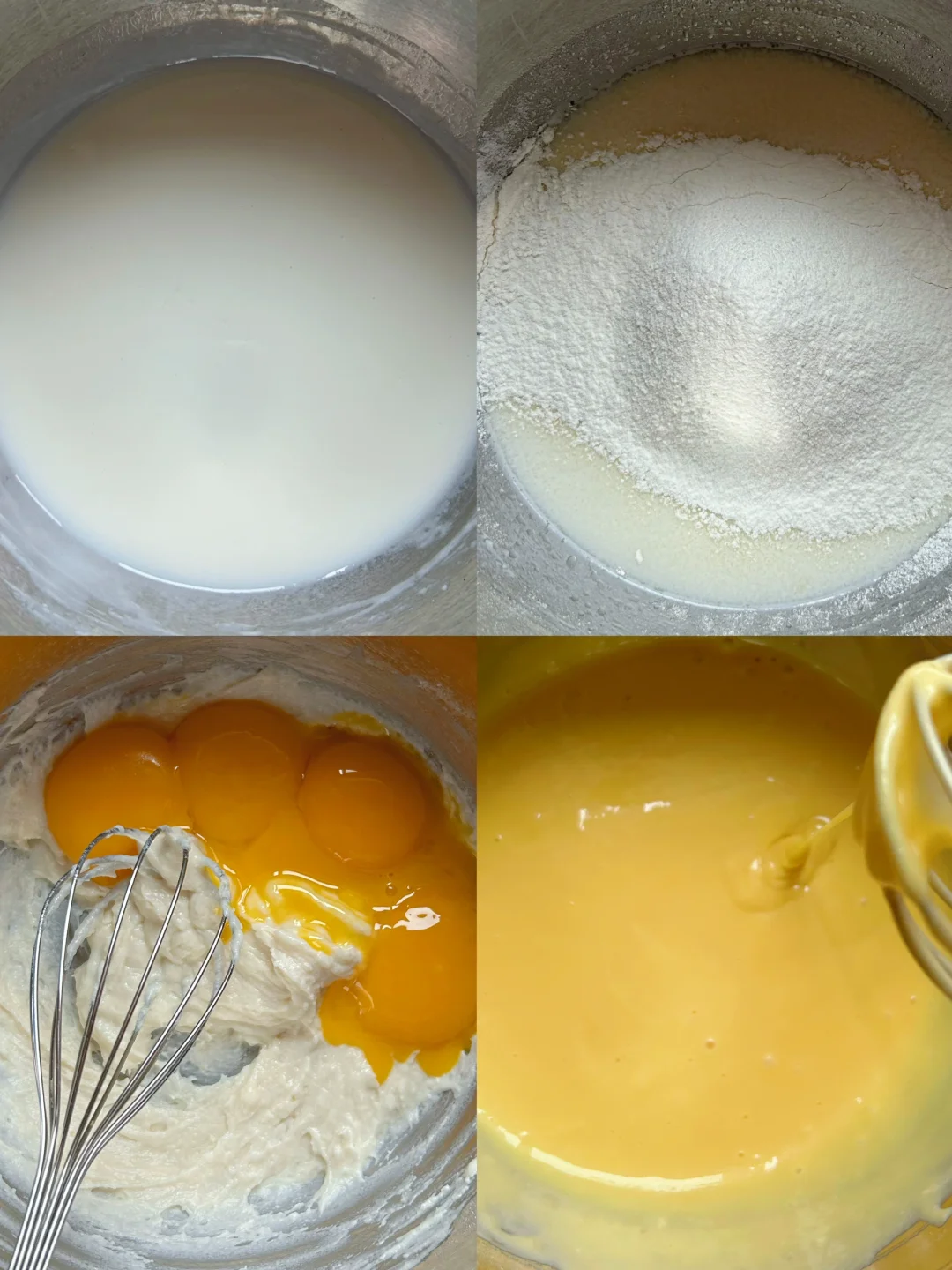 1️⃣玉米油加入牛奶搅拌至酸奶状,筛入低筋面粉搅拌到没有干粉,加入蛋黄搅拌顺滑。