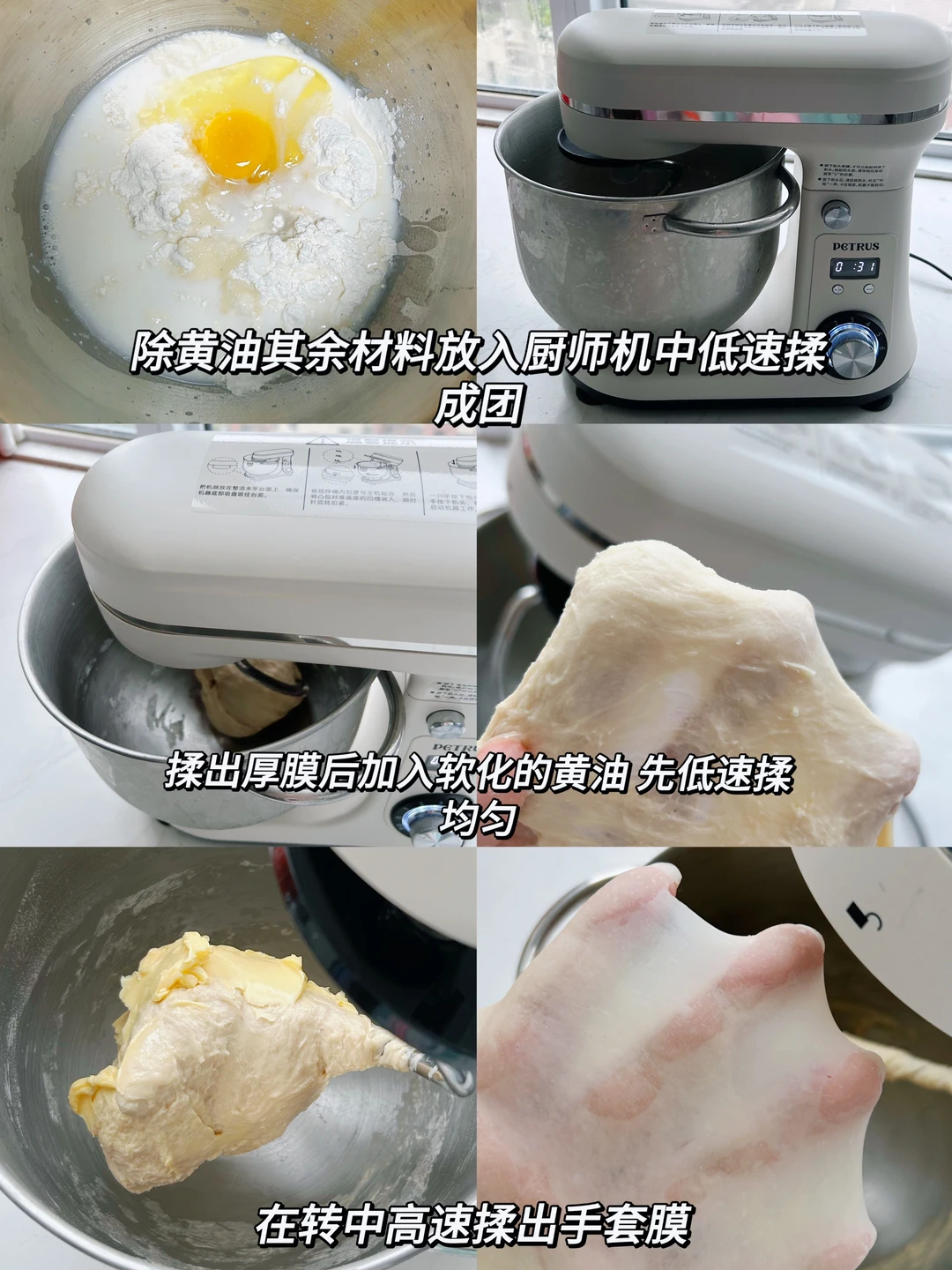 1️⃣除黄油外其他材料全部放入厨师机中,先开低速混合成团,揉出粗膜后加入软化好的黄油,低速混合均匀后转中高速揉出手套膜。