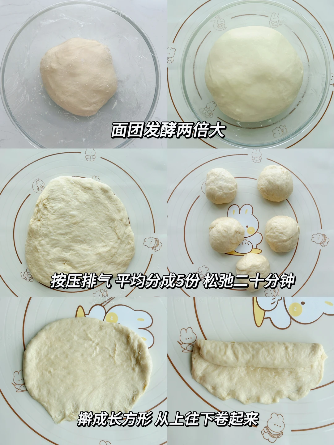 3️⃣发酵好的面团按压排气平均分成5份,整理成圆形,盖保鲜膜松弛20分钟,用擀面杖擀成长方形,从上向下卷起来,从中间往两边搓长,表面刷全蛋液,粘上芝士碎,放入烤箱选择发酵模式,30度50分钟,进行二次醒发。