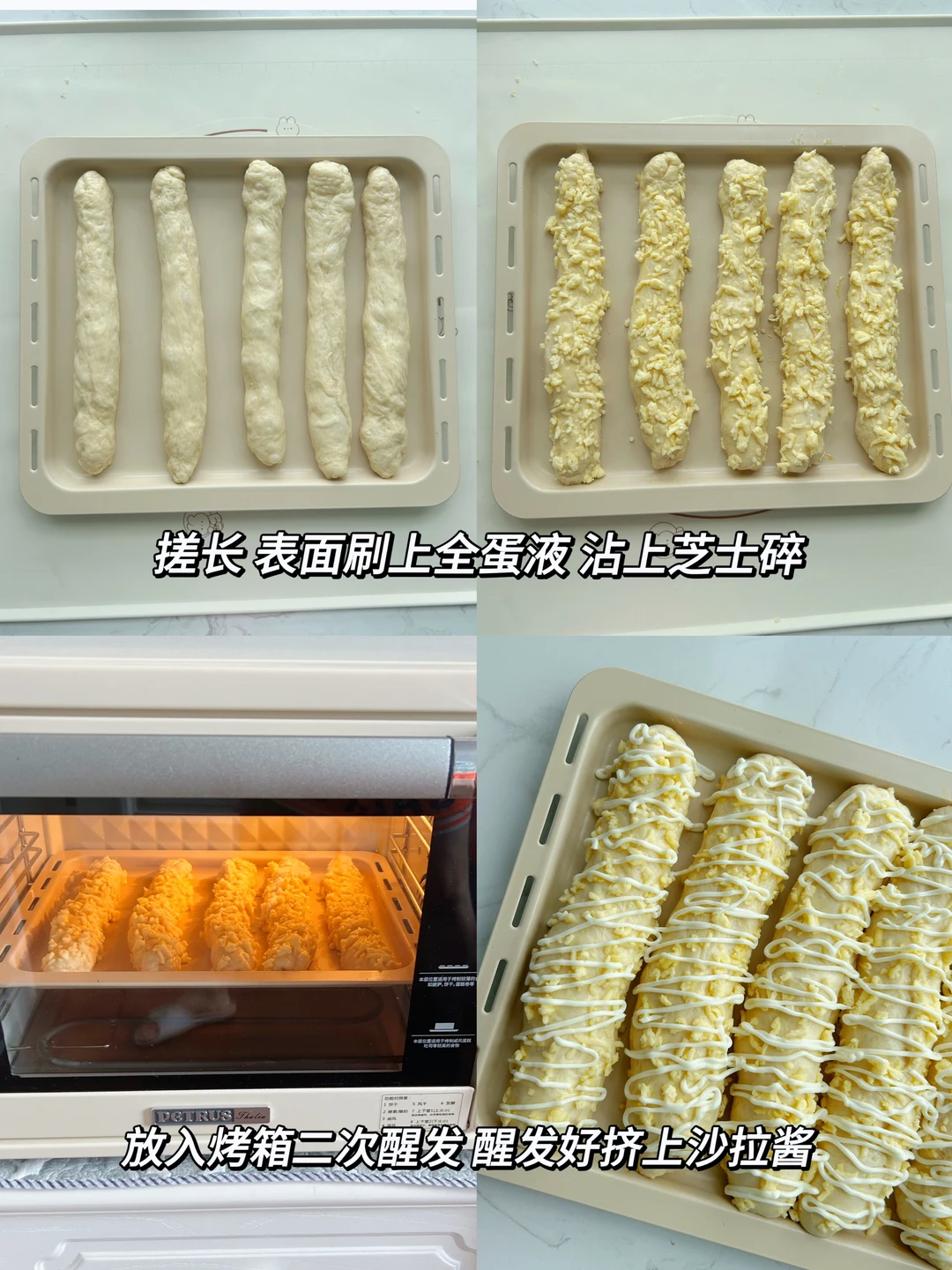 4️⃣醒发好挤上沙拉酱,放入预热好的烤箱上下火160度烤20分钟,(同款柏翠5400烤箱可参考这个温度)