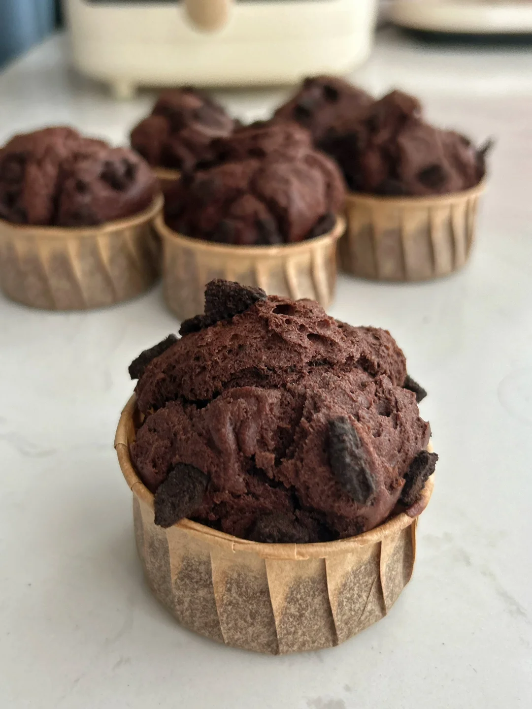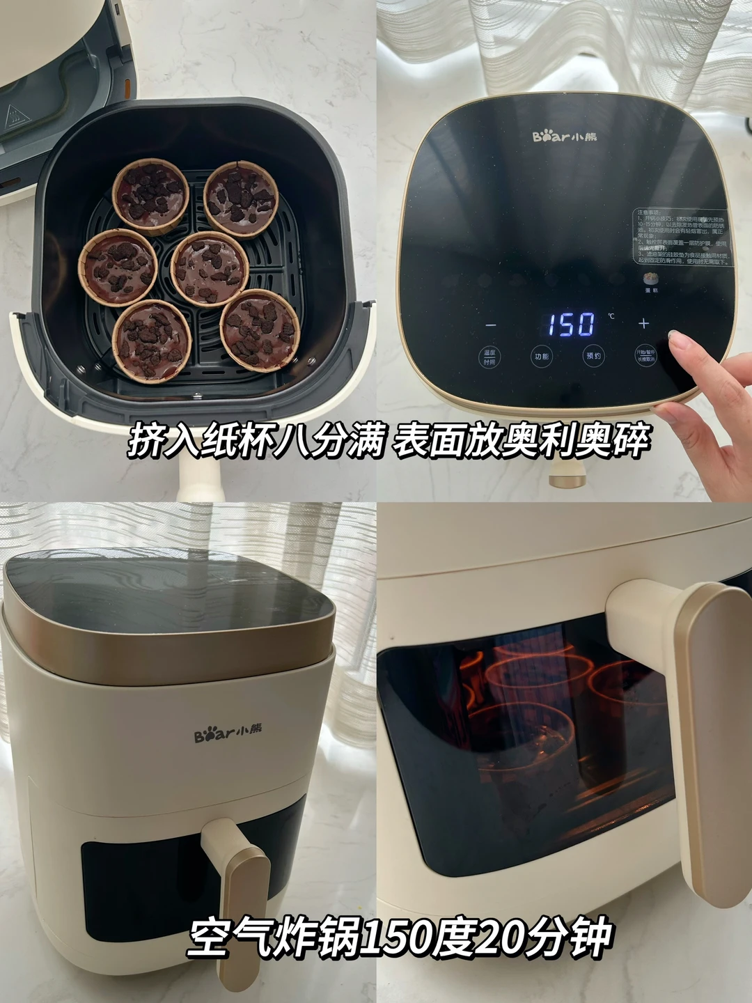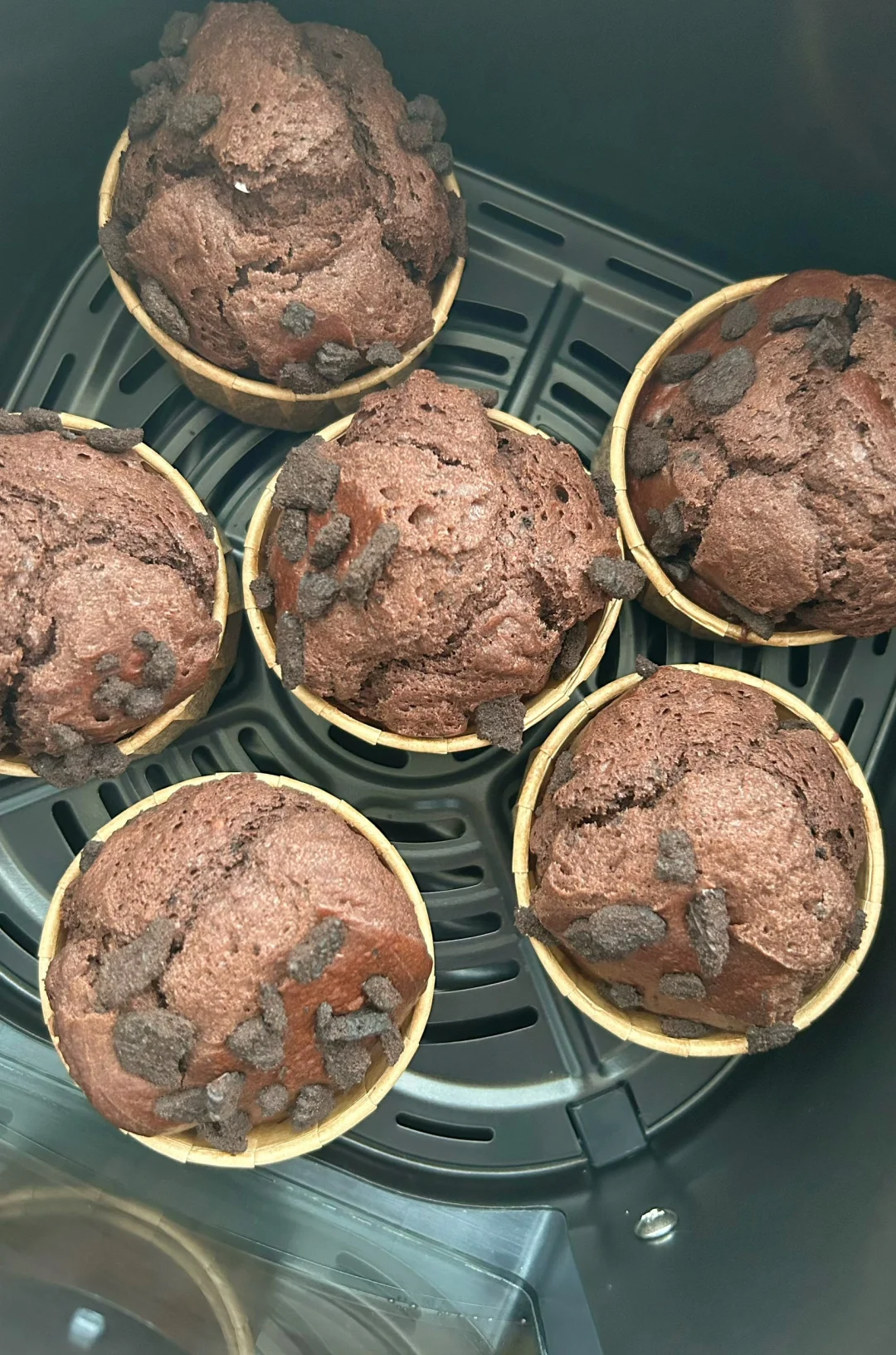 3.面糊装进裱花袋挤入纸杯八分满,表面撒上奥利奥碎,放入预热好的空气炸锅,150度20分钟。
