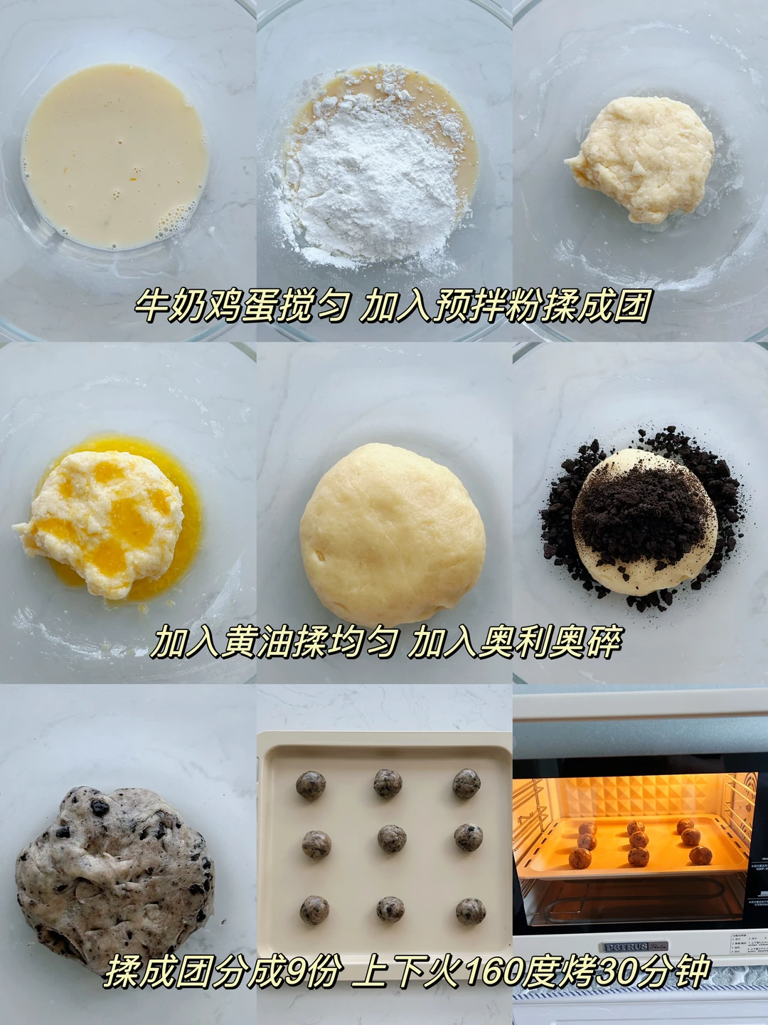 1. 蛋液加入纯牛奶搅拌均匀,加入麻薯预拌粉揉成团,加入软化好的黄油揉均匀。加入奥利奥碎揉均匀。