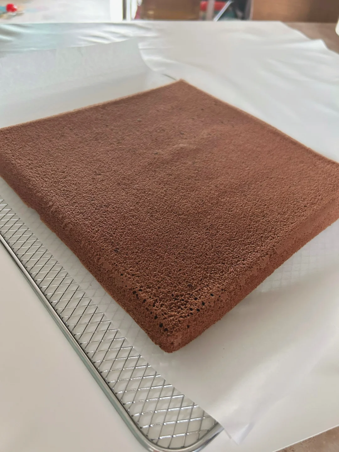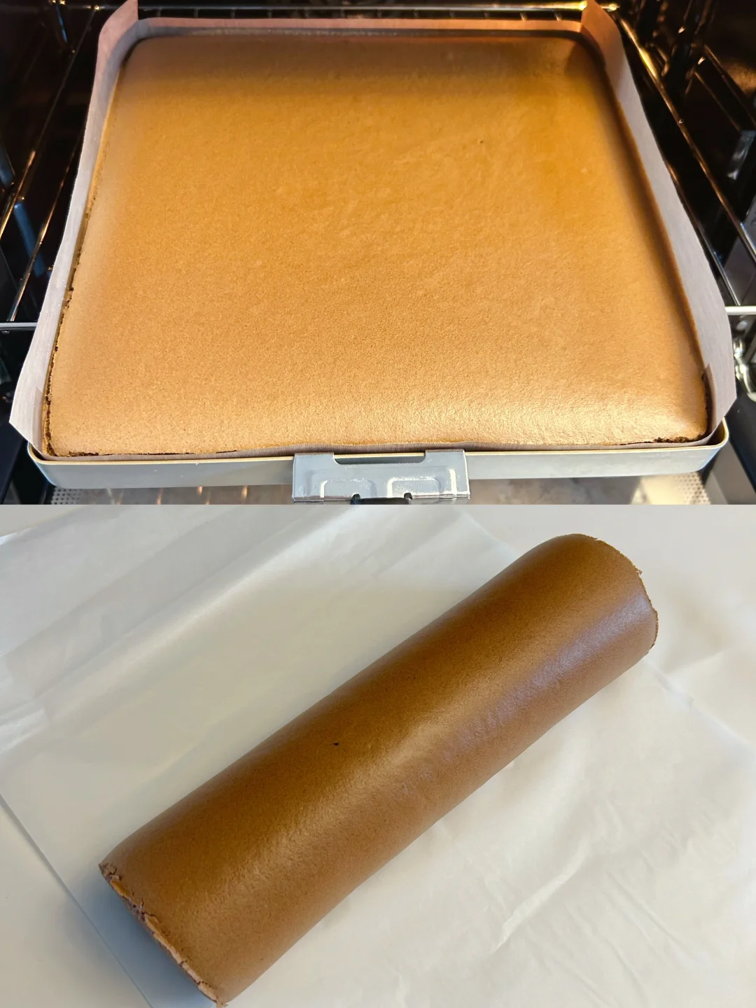 5️⃣烤好的蛋糕卷拎起油布放在晾网上晾凉,晾至温热再撕掉四周的油布,避免回缩,最后借助擀面杖卷起定型。
