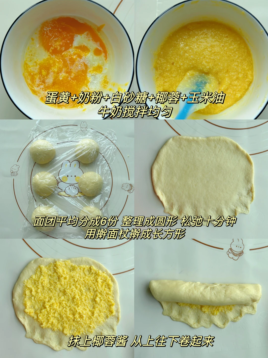 4️⃣发酵好的面团平均分成6份,整理成圆形,盖保鲜膜松弛10分钟,用擀面杖擀成长方形,抹上椰蓉酱,从上向下卷起来,放入28×28的烤盘中,送进烤箱选择发酵模式,30度60分钟,进行二次醒发。