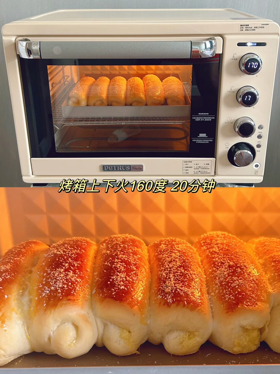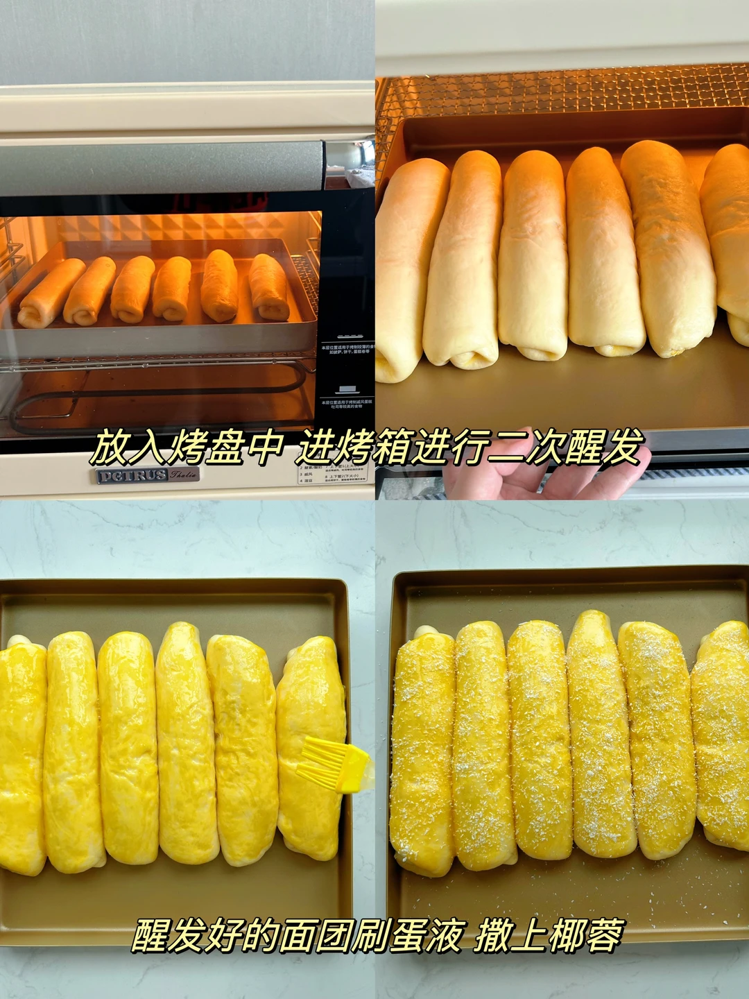 5️⃣醒发后表面刷上蛋液,撒椰蓉,放入预热好的烤箱上下火160度烤20分钟,(同款柏翠5400烤箱可参考这个温度)