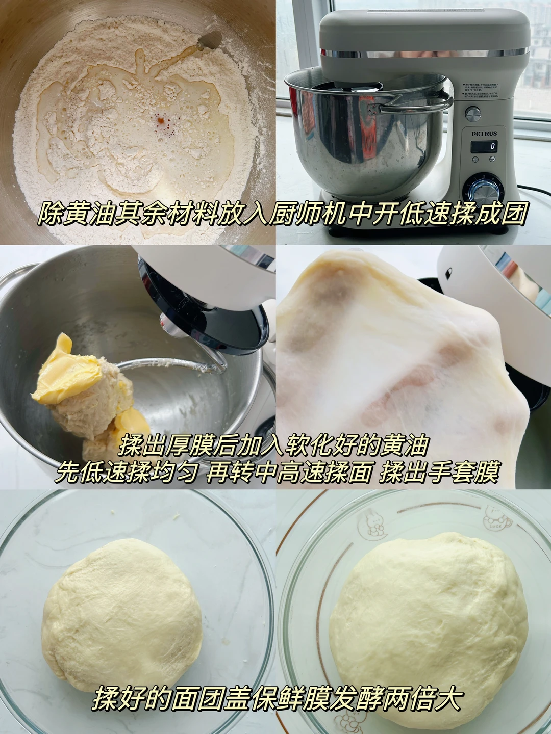 1️⃣除黄油外其他材料全部放入厨师机中,先开低速混合成团,再转中速揉出粗膜,加入室温软化好的黄油,低速混合均匀后转中高速揉出手套膜。