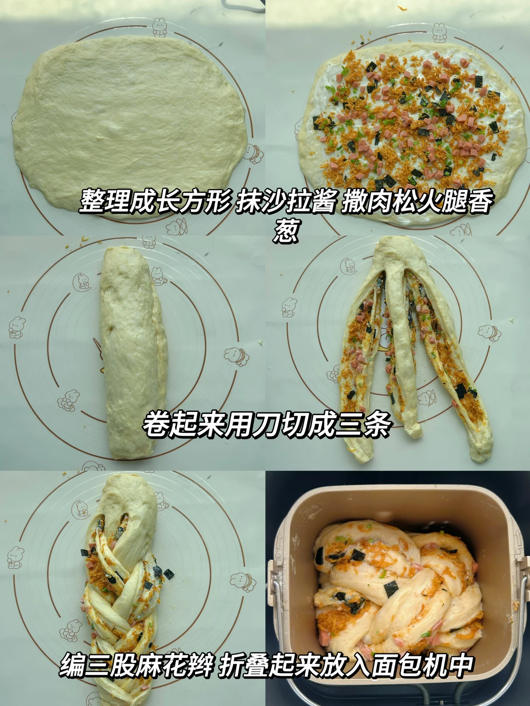 3.发酵好的面团按压排气,用擀面杖擀成长方形,抹沙拉酱,撒肉松、火腿丁、香葱,从上向下卷起来用刀切成三条,不要切断,编三股麻花辫,两头向下折叠。
