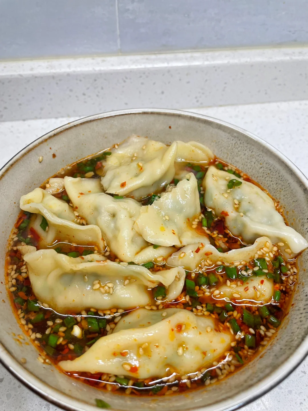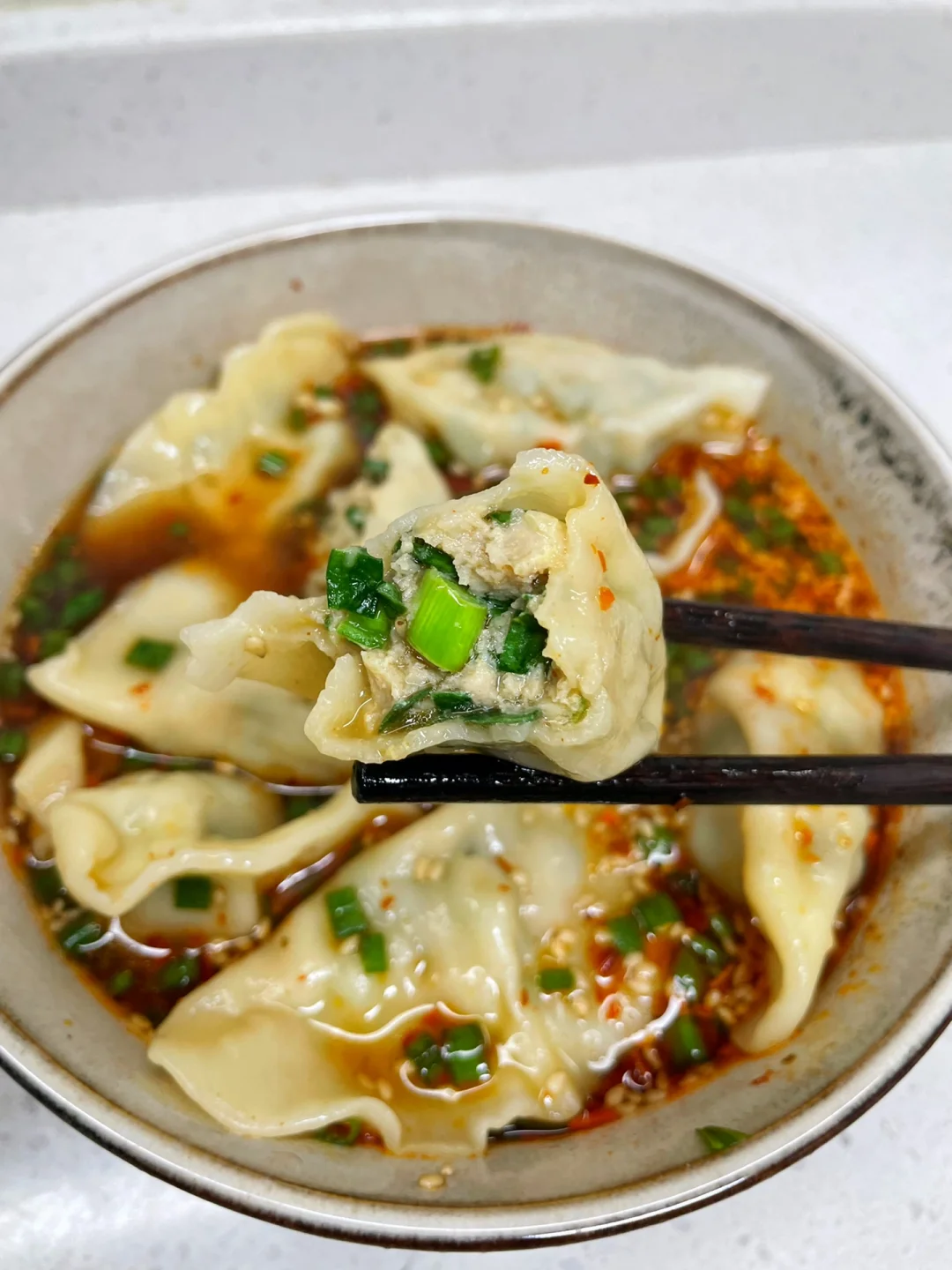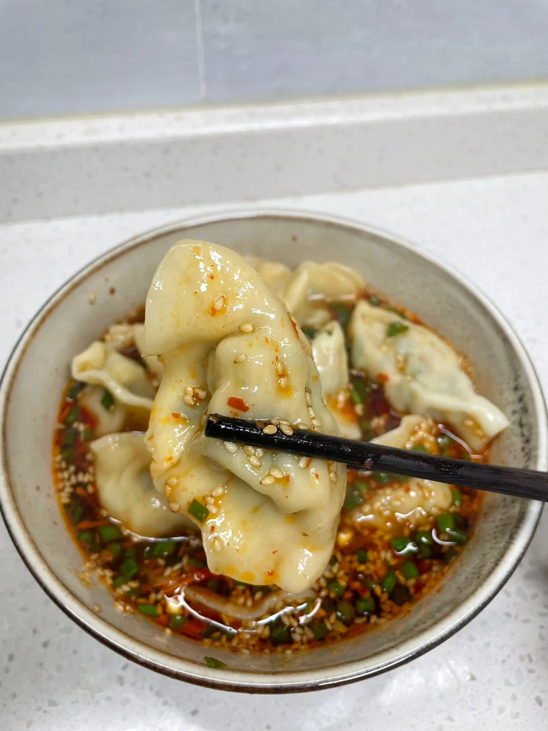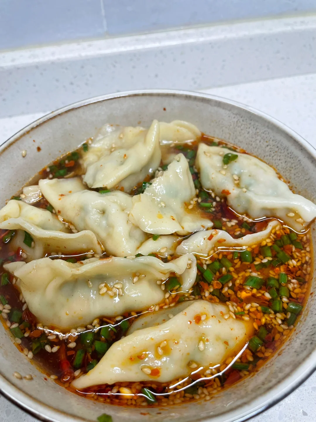 谁能拒绝冬天的水饺,暖心又开胃,一碗下去整个人都暖和了~ 食材:肉末 韭菜 鸡蛋 配料:盐 生抽 胡椒粉 蚝油 辣椒面 花椒面 白芝麻 葱花 蒜末 陈醋 馅料:肉末和韭菜末加鸡蛋 盐 生抽 蚝油 胡椒粉搅匀 调料:辣椒面 花椒面 白芝麻 葱花 蒜末淋热油 生抽 陈醋 盐 香油加高汤 水开下入水饺煮熟捞出拌匀即可~