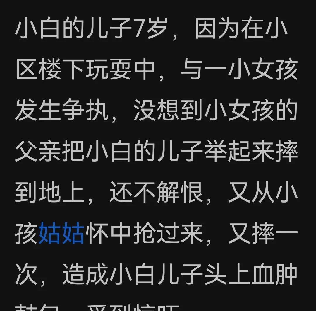 孩子被同学家长摔伤,伤者爸爸是央视某主持人。 7岁的小孩子一起玩耍,在这个过程中发生了矛盾是非常正常的事情,相信大部分孩子都遇到过,而且双方家长都在现场,正确的做法是都管好自己的孩子,都教育自己的孩子,然后两孩子握手言好。可是这位白姓主持人的儿子却被对方孩子的爸爸两次抱起摔伤,导致头部有一定程度的出血鼓包,孩子也受到很大的惊吓,这种做法不单单是道德问题,只拘留、罚款,是不是有点草率了?