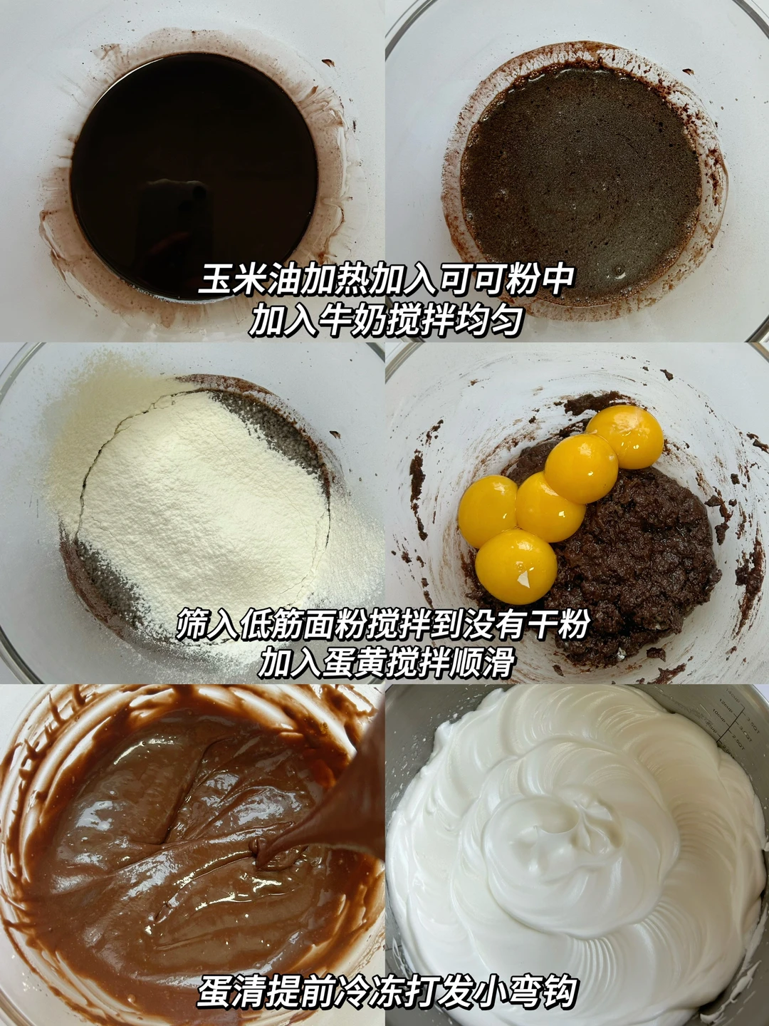1️⃣玉米油加热后加入可可粉中搅拌均匀,加入牛奶搅拌均匀,筛入低筋面粉搅拌到没有干粉,加入蛋黄搅拌顺滑。