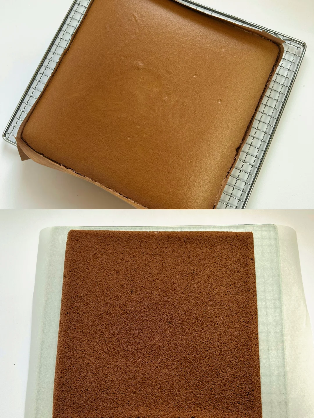 5️⃣烤好的蛋糕卷拎起油布放在晾网上晾凉,晾至温热再撕掉四周的油布,避免回缩,最后借助擀面杖卷起定型。