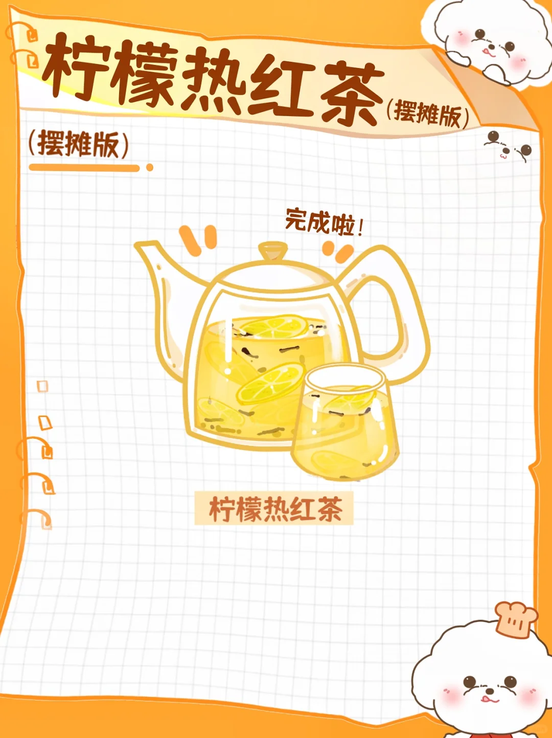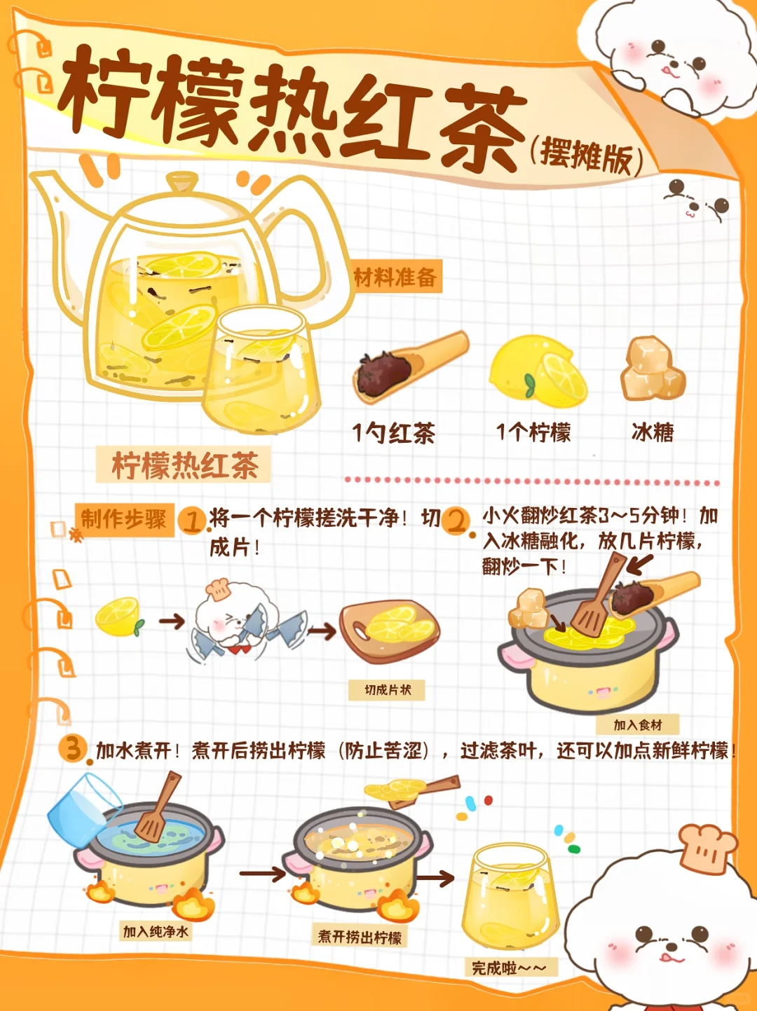 柠檬热红茶(摆摊版) 暖暖秋冬!热红茶绝配🔥, 还有柠檬的清香!酸酸甜甜的口感绝对迷人! 在寒冷冬天里,来一杯柠檬热红茶,温暖一整天!🍹 🥣材料准备 1勺红茶➕1个柠檬➕冰糖 🥣制作步骤 1⃣️将一个柠檬搓洗干净!切成片! 2⃣️小火翻炒红茶3~5分钟!加 入冰糖融化 放几片柠檬翻炒一下! 3⃣️加水煮开!煮开后捞出柠檬(防止苦涩),过滤茶叶,还可以加点新鲜柠檬,完成啦~~