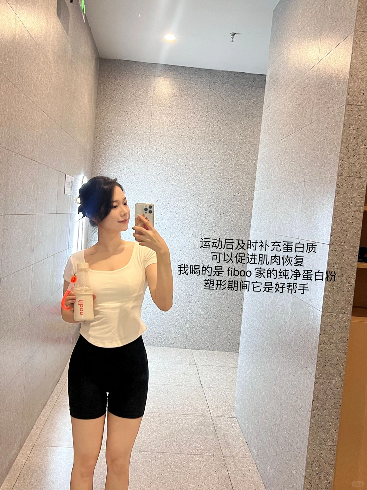 我会保证一周3-4次,抗阻训练与有氧运动,这有助于身体的紧致,这是我保养很重要的一部分,在这个期间,蛋白质是我的日常能量来源,除了从食物中摄取优质蛋白,我也会适当补充喝 fiboo 纯净蛋白粉,塑形期间它是好帮手,可以保证我一天蛋白质的充足。