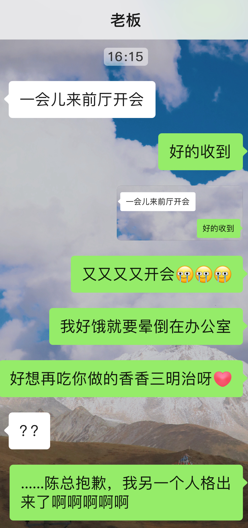#四点一刻 横扫饥饿# 要我说安陵容在演我吧#周一的我被确诊为安陵容# !今天竟然饿到头昏眼花把一条发给crush的微信,发给了我的领导!而且还是一条充满了饥饿感叹的消息!等发现已经不能撤回了…苦中作乐一下,领导给的半糖士力架还挺好吃的,吃了一条超级扛饿诶~