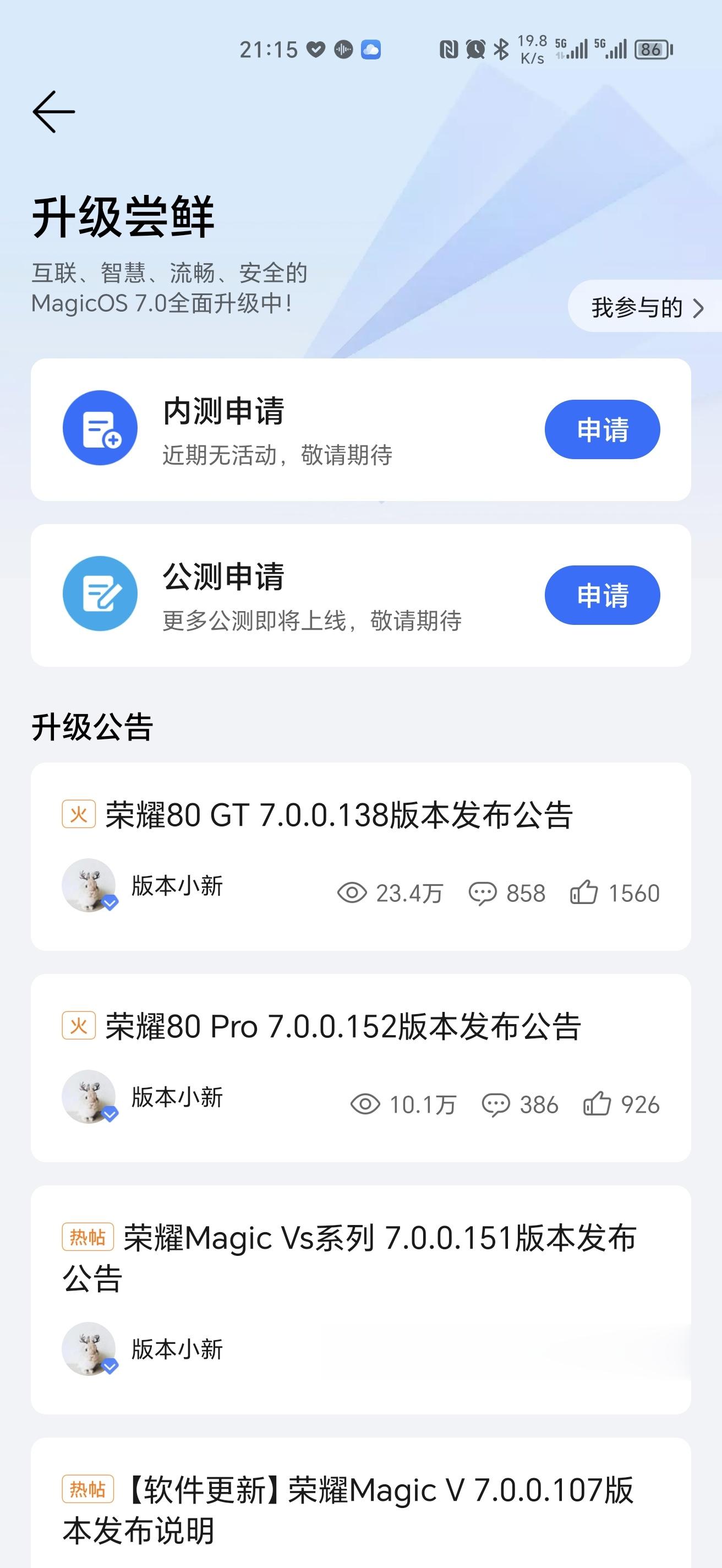 我的荣耀app更新新版本,内测申请/公测申请,MagicOS 大版本新系统更新应该快了,MagicOS 8,荣耀Magic6系列肯定是出厂预装了