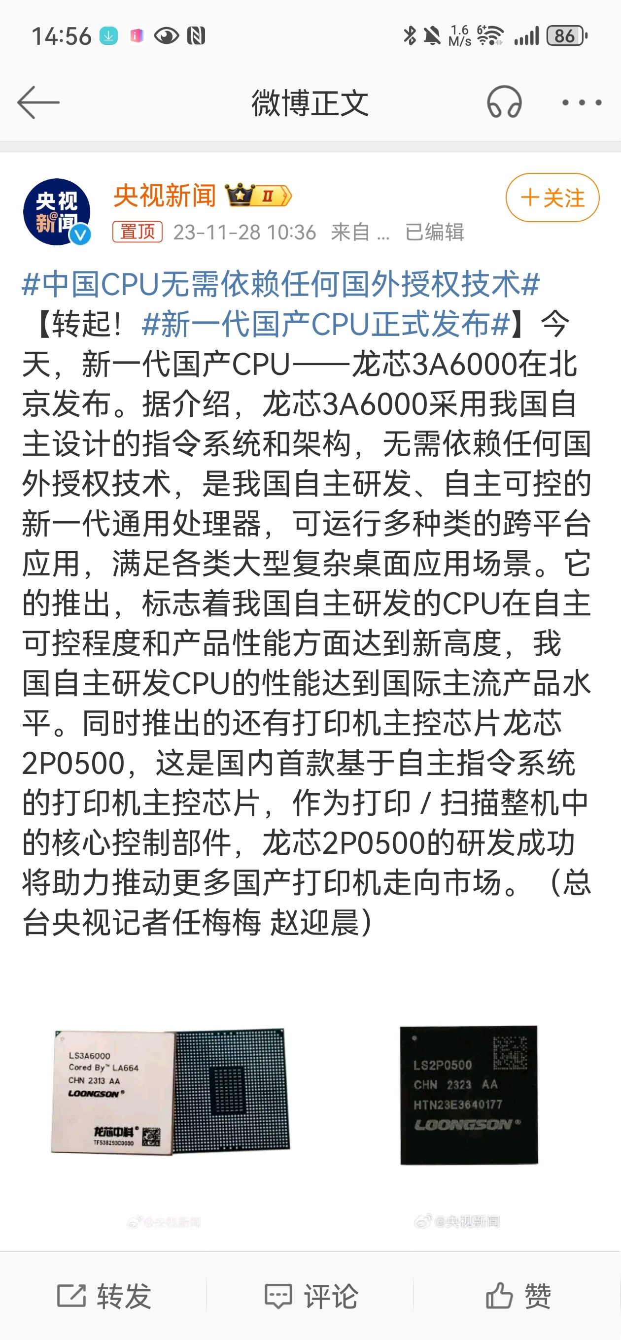 #新一代国产CPU正式发布#龙芯3A6000,四大核四小核设计,主频最高2.5GHz,龙芯第四代微构架LA664构架,支持国密算法,多线程,比上代单、双线程性能分别提升60%、100%。