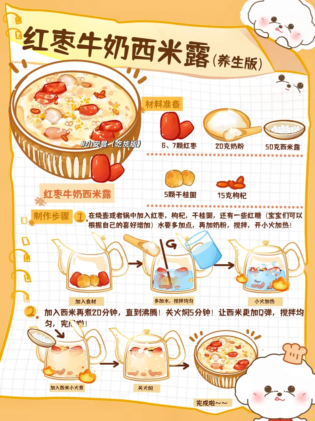 6、7颗红枣➕20克奶粉➕50克西米露➕5颗干桂圆➕15克枸杞