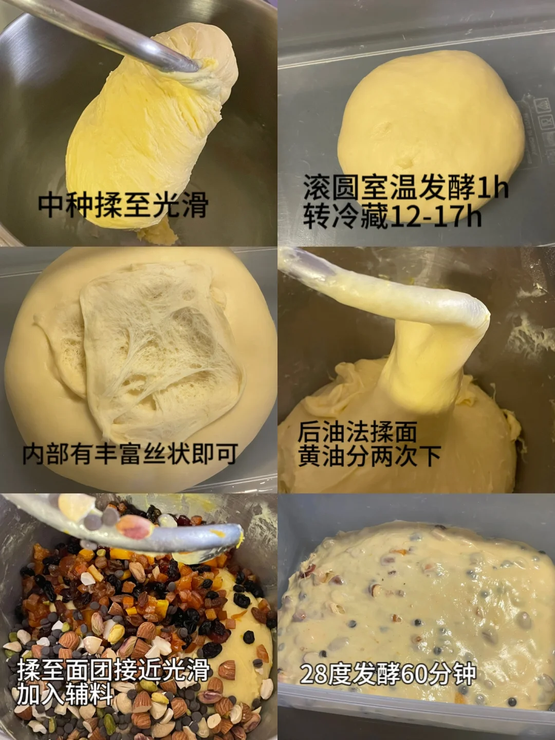 主面团:高筋面粉150g|糖80g|盐10g|法国老面170g|蜂蜜20g|干酵母2g|蛋黄110g(约5-6个)|浓稠酸奶20g|橙皮屑3g(约一个橙子)|香草荚一个|黄油150g|果干400g|巧克力豆30g|巴旦木30g