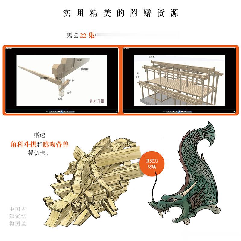 这本还赠送了22集古建结构演示动画,以及角科斗拱和鸱吻脊兽模切卡,可以更直观的了解和感受中国优秀的古建文化。