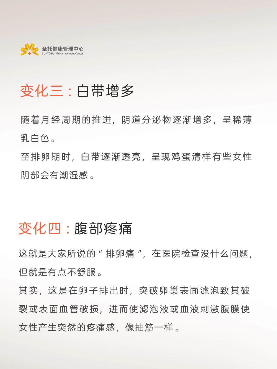 🧚我们都知道,女性的月经周期是一个复杂而神秘的过程,由4个不同的阶段组成,包括 🌈卵泡期 🌈排卵期 🌈黄体期 🌈行经期 😆其中,排卵期是一个让人又爱又恨的阶段。 ✅对于计划怀孕的女性来说,排卵期是一个非常关键的时期,在这个时候受孕的机会最高。 😣但对于其他女性来说,排卵期可能带来一些不适,例如私处出血、腹部疼痛、炎症等症状。 👑上图中总结的四个排卵期变化希望能帮助你更好地了解身体、照顾身体。 🙋🏻♀女性的卵子关乎着生育力和身体健康,需要重视起来哦~