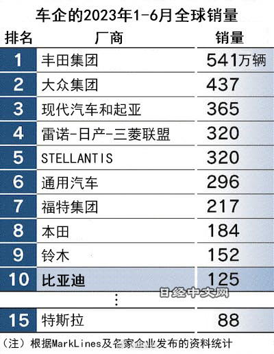 去年全球汽车品牌销量榜前十还找不到中国车企的身影,比亚迪186万年销量也只排到第十三名,今年上半年比亚迪销量125万辆,进入前十。