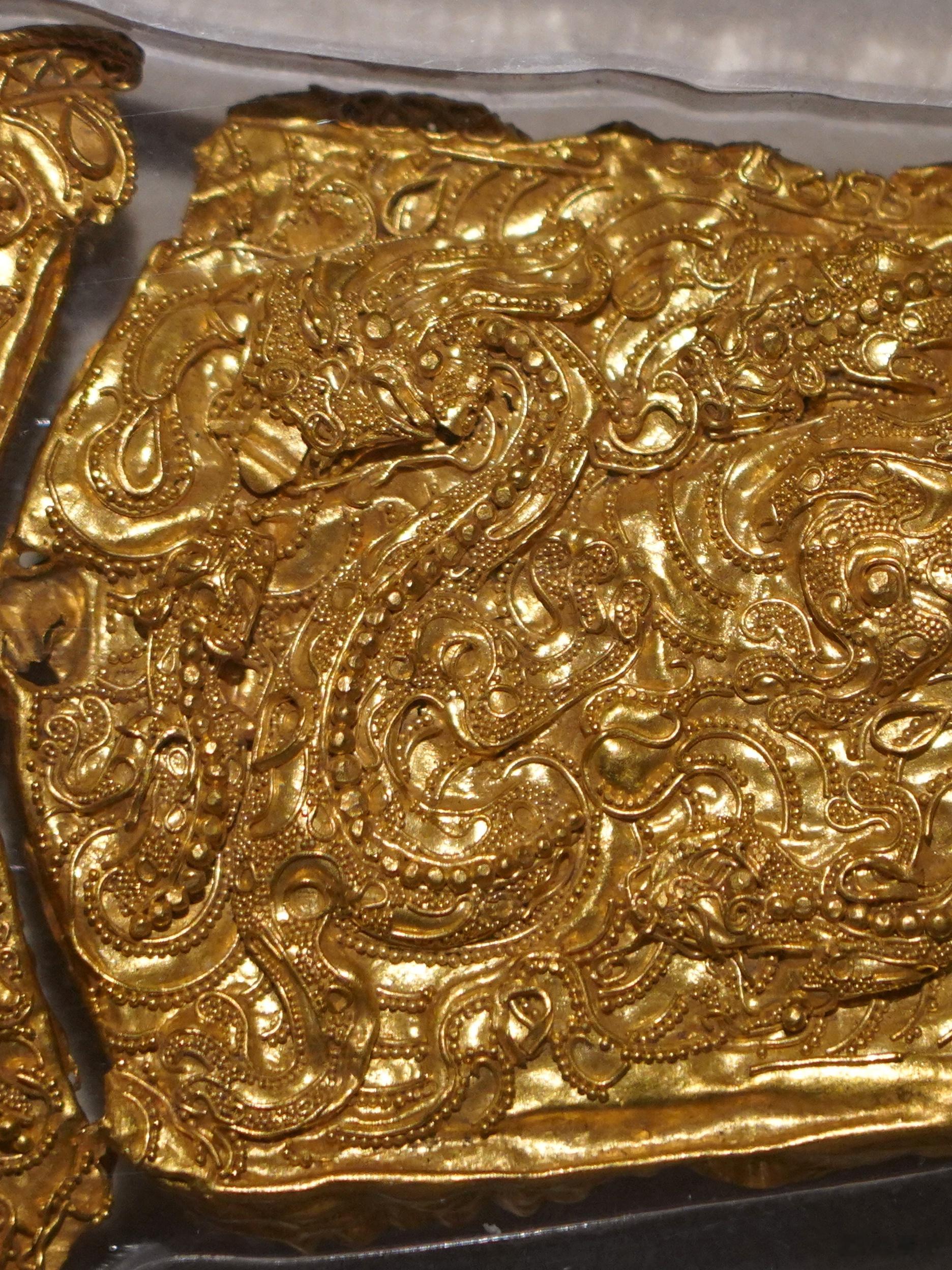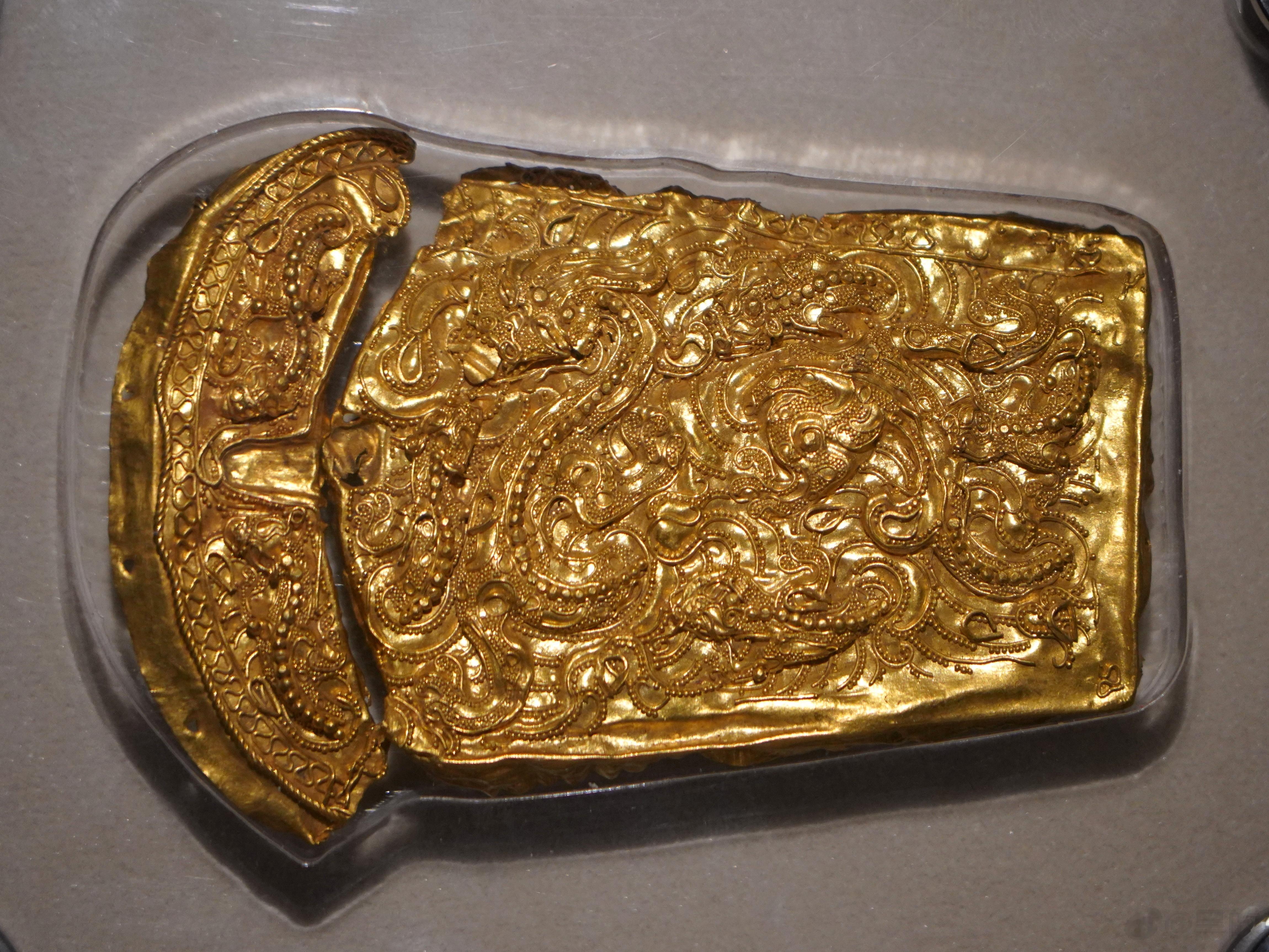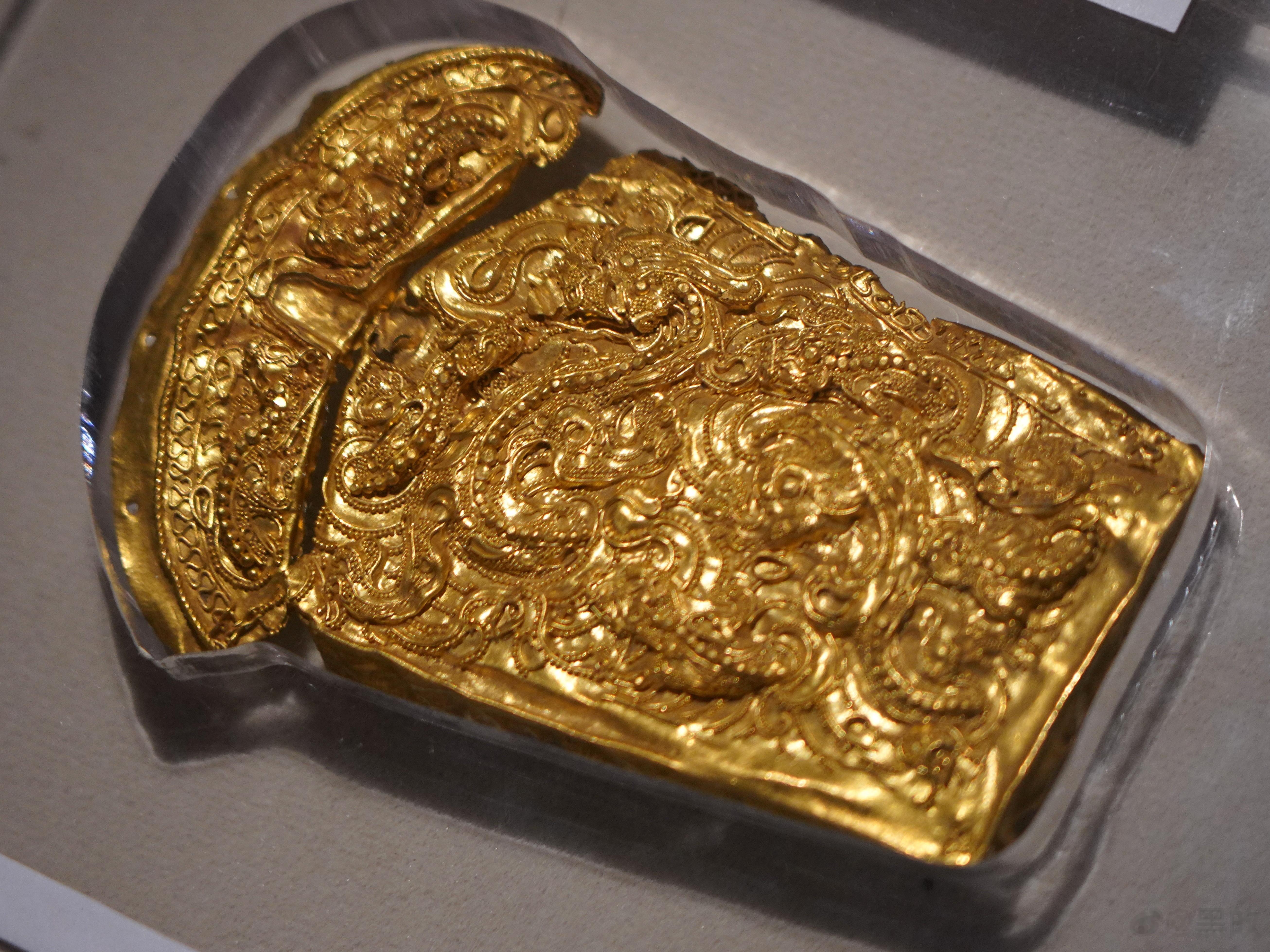 东汉时期遗存,天水市博物馆藏,一件源于捐赠的一级品,国博古代服饰文化展换展时所见。带扣呈圆首方尾的马蹄形,前端开弧形带孔,背面凹凸不平,系用锤揲工艺打制而成,带扣表面用掐丝焊珠工艺制作纹饰