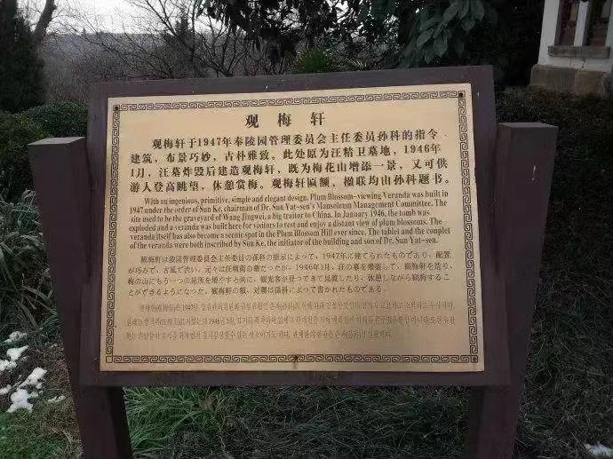 大汉奸汪精卫的墓! 用了5吨坚硬的碎钢块掺在混凝土里,然后浇灌成厚厚的墓壳。以为这样就能安全地保护好汪的尸体。没想到仅仅过了10个多月,抗日战争就胜利了。在全国人民的一片呼声中,南京人民对汪精卫的坟墓留在梅花山十分不满,纷纷要求铲除。蒋介石在舆论的压力下,派何应钦扒掉此墓。南京某部工兵营用了150公斤德制TNT炸开墓壳,劈开棺材。 汪精卫的尸体随后连同棺材被运往清凉山火化,骨灰被丢弃于路边的一个水坑里。工兵营当夜平整好坟地,在坟地上建了一座小亭“观梅轩” 历史上,汉奸一定不会有好下场的