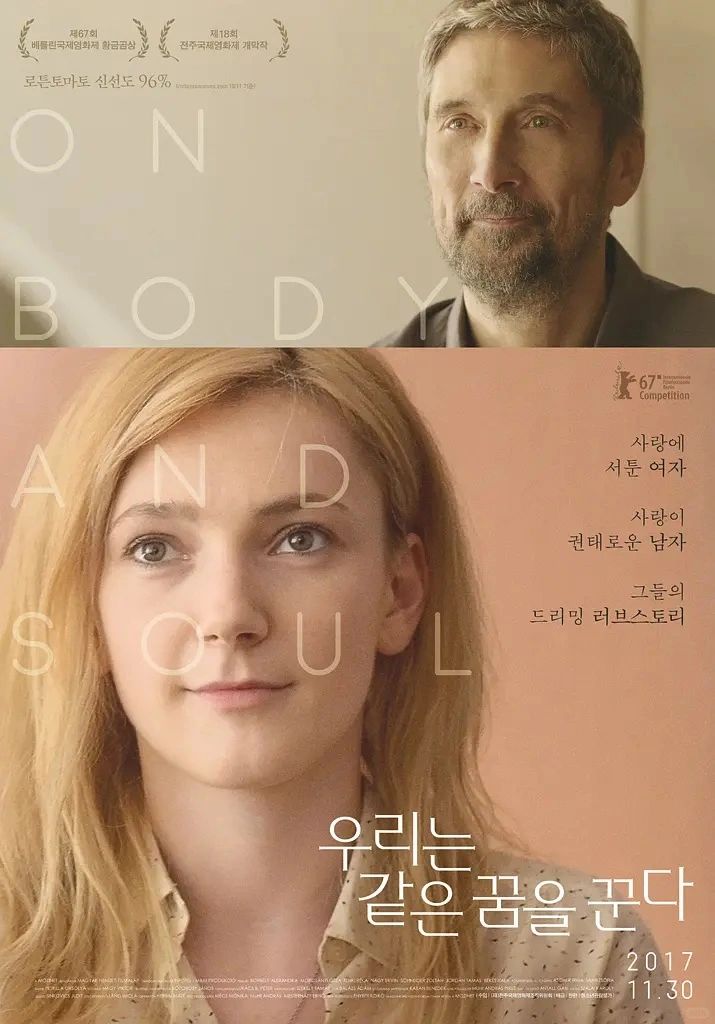 《肉与灵》可能是我看过的所有影片中极其特殊的一部,它只有一个极其简单的故事,格扎饰演的男主安德是一家屠宰场的老板,中年男性,左手残疾,常年独居;亚历山德拉饰演的女主玛利亚患有严重的交流障碍和强迫症,常年寡居。一个非常偶然的机会,玛利亚成了屠宰场的质检员。