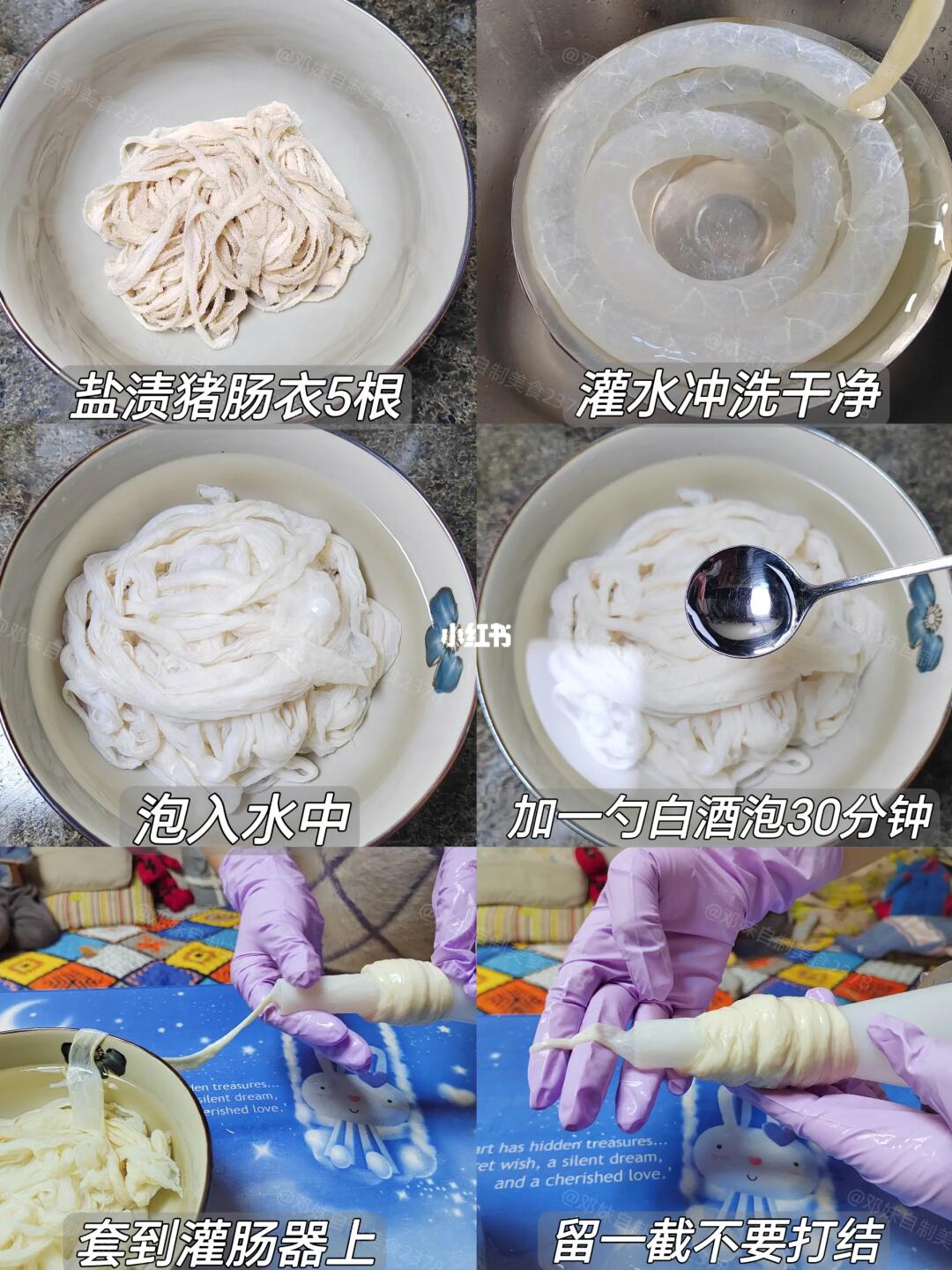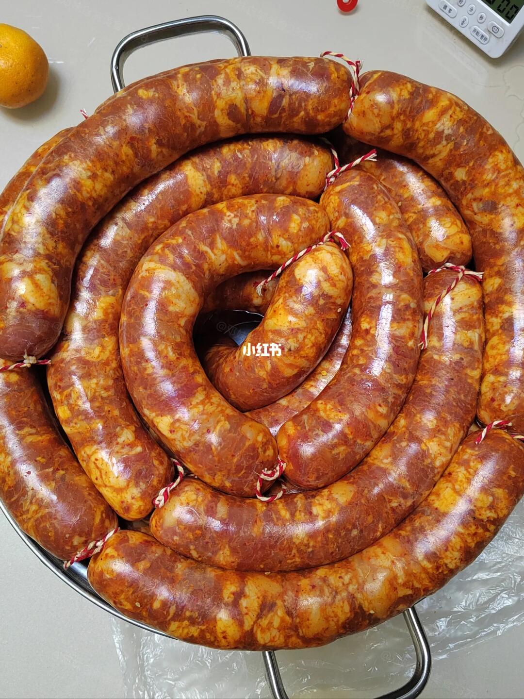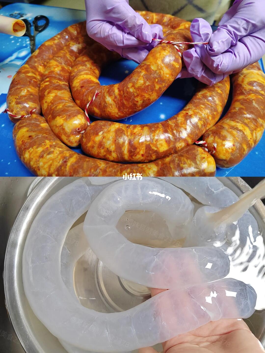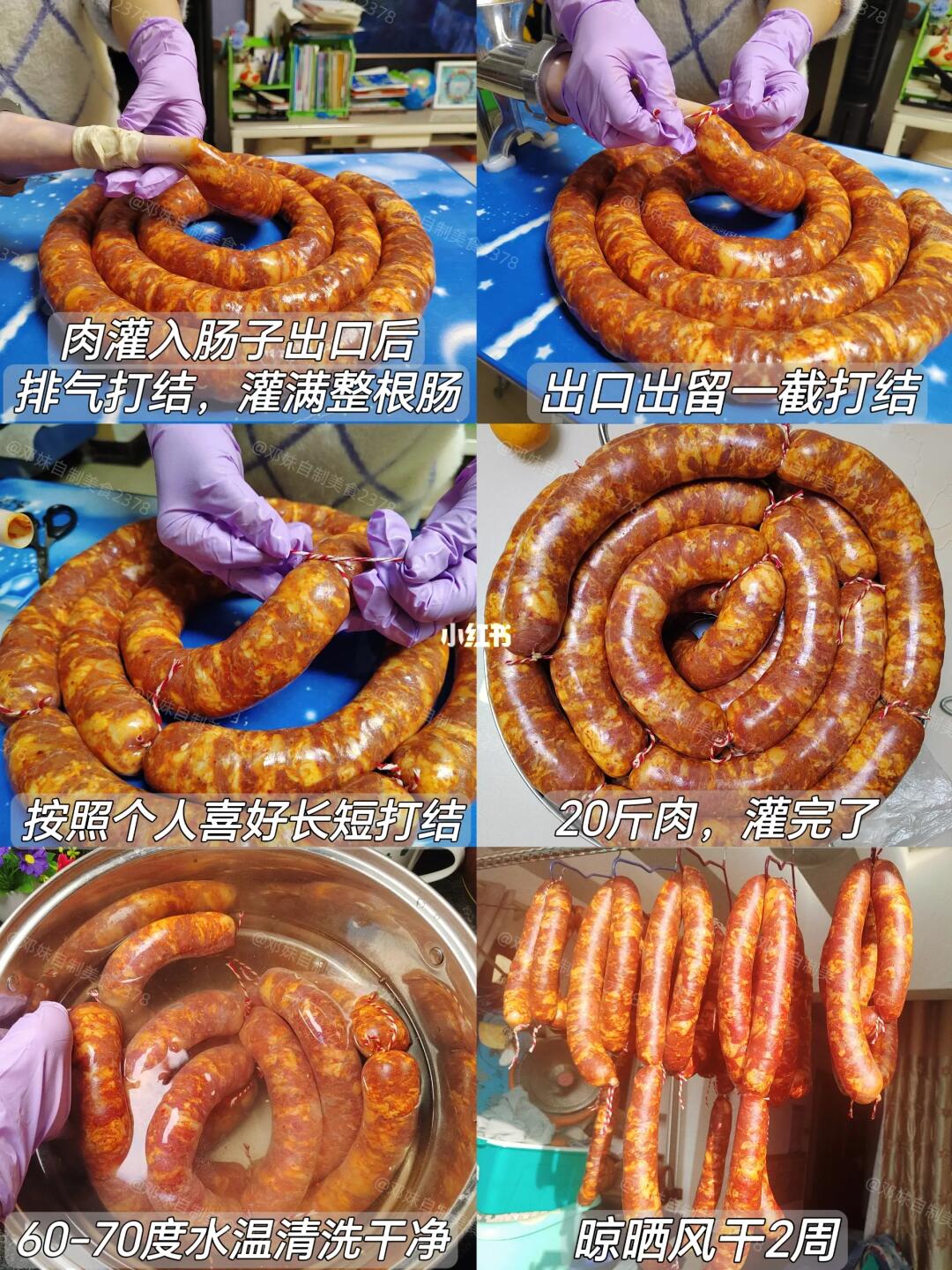 🔴灌好的香肠要用60-70度的水洗,然后分散挂通风处 ,不能挂一团哟,表面才不会发霉,不会🈶虫子爬;让做出来的香肠更香。
